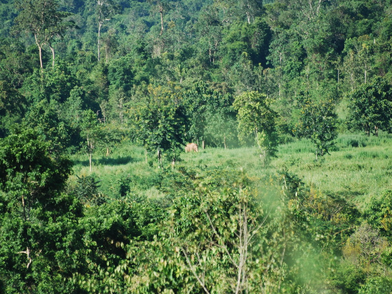 หลังจากซุ่มดูอยู่ประมาณหนึ่งก็เห็นช้างป่าเดินออกมาโชว์ตัวครับ ทำให้มีแววว่ากระทิงจะออกมาให้ดู เนื่องจากตามธรรมชาติช้างป่ากับกระทิงจะหากินอยู่ในบริเวณใกล้เคียงกันครับ แต่เจ้าหน้าที่กำชับว่าต้องเงียบและทิศทางลมเป็นสิ่งสำคัญเนื่องจากกระทิงเป็นสัตว์ที่มีประสาทดมกลิ่นดีมาก หากทางลมพัดจากเราไปหาเขา กระทิงจะหลบไม่ออกมาให้เห็นครับ