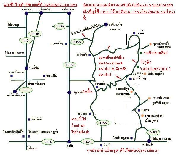 จากชลบุรีมาทางมอเตอร์เวย์-วงแหวนตะวันออก-บางปะอิน ผ่านอยุธยา-นครสวรรค์-พิษณุโลก-อุตรดิตถ์-แพร่ ถึงแยกร้องกวาง เลี้ยวซ้ายไป อ.งาว-พะเยา ก่อนถึงพะเยา มีทางเลี้ยวขวาไปดอกคำใต้-จุน-เชียงคำ-ภูซาง-ภูชี้ฟ้า ช่วงไปผาตั้งมีทางลูกรังประมาณ 10 กม. รถเก๋งไปลำบากหน่อยครับ จากผาตั้งให้กลับทางเดิมมาภูชี้ฟ้า เลี้ยวขวาที่แยกบ้านร่มฟ้าไทย ไปบ้านเช็งเม็ง เลี้ยวขวาไปบ้านปางหัด ***อย่าลงทางผาตั้ง-บ้านปางหัดนะครับทางโหดมากกกกก เก๋งผ่านไม่ได้***** เส้นเลาะริมโขงก็พอใช้ได้ วิวสวยดีครับ ผ่านแยกเวียงแก่น-เชียงของ-เชียงแสน-สามเหลี่ยมทองคำ-แม่สาย ดูแผนที่ทางหลวงประกอบจะดีที่สุดครับ เพราะแผนที่ที่ส่งมานี้ไม่ตรงกับสัดส่วนของจริงครับ