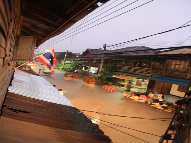เด็กวัดก็ตีระฆังบอกญาติโยมให้หุงหามาถวายพระที่วัด แต่ที่นี่พิเศษกว่า ฝนตกพระก็ต้องออกมาบิณฑบาตร เพื่อความอะเมซิ่งของนักท่องเที่ยว