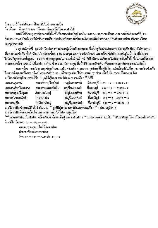 นอกเหนือจากการไต่ถามทุกข์สุขด้วยความเป็นห่วงแล้ว การบรรเทาทุกข์และฟื้นฟูจิตใจคงเป็นเรื่องต่อไปที่พวกเราจะต้องช่วยกัน จึงอยากเชิญชวนเพื่อนสมาชิกคุ้มครองสัตว์ป่า และ เพื่อนๆทุกท่าน ได้ร่วมสมทบทุนช่วยเหลือพี่น้องภาคเหนือของเรา โดย