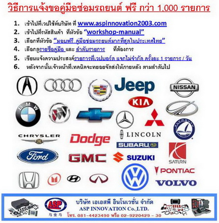 มอบให้ฟรีแหล่งคู่มือซ่อมรถยนต์ที่ใหญ่ที่สุดในประเทศไทย !!!!! เพื่อเป็นความรู้กับอู่ซ่อมรถยนต์ ทั่วประเทศไทย หรือ บุคลทั่วไป หรือ โรงเรียนอาชีวะศึกษาทุกจังหวัดทั่วประเทศไทย ที่สนใจไว้ศึกษา แจ้งขอได้ฟรี กว่า 1,200 รายการ และ อัพเดทเพิ่มใหม่ๆที่