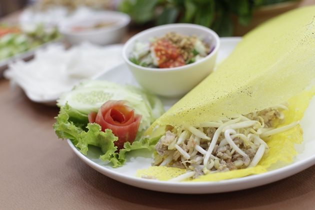 จานต่อไปที่อยากแนะนำ คือ ขนมเบื้องเวียดนาม หรือที่เราเรียกกันว่า ขนมเบื้องญวน นั่นเอง ไข่ที่กรอกเป็นแผ่นบางกรอบสีเหลืองสวย ห่อหุ้มไส้ที่อยู่ภายในไว้อย่างสวยงาม เวลาจะทานก็ตัดเป็นคำพร้อมส่งเข้าปากได้อย่างง่ายดาย และเข้ากันดีกับน้ำจิ้มที่ปรุงมาเป็นพิเศษ หลายคนมักจะนึกถึงจานนี้เพราะหาทานอร่อยยาก ก็ต้องมาที่นี่เลยทีเดียว
