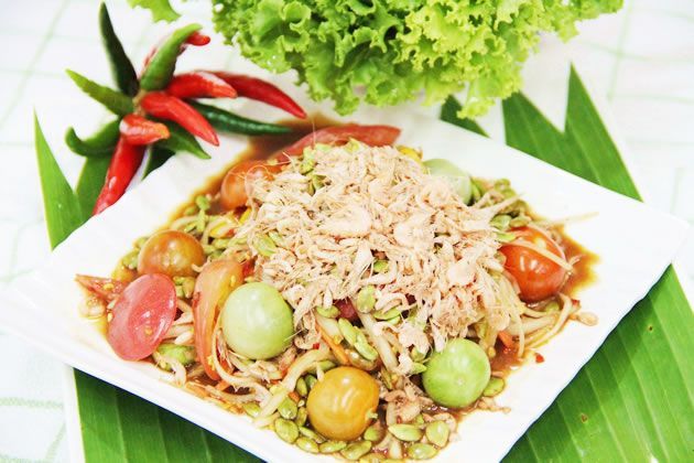 เมนูเด็ดมีหลายอย่าง เริ่มต้นกันที่ ส้มตำหนองคาย ที่เห็นสั่งกันแทบทุกโต๊ะเหมือนเป็นจานหลัก หน้าตาจะแปลกไปกว่าส้มตำทั่ว ๆ ไป เพราะมีเม็ดกระถินที่ลงทุนแกะออกมาเป็นเม็ด ๆ กับกุ้งฝอยตัวจิ๋ว ๆ กรอบ ๆ โรยหน้ามาจนพูน เคล็ดลับความอร่อยอยู่ที่ปลาร้าต้ม ที่ซ่อนอยู่ในจาน ปรุงรสจนไม่มีกลิ่นฉุน คนกรุงเทพฯ กินได้สบายมาก รสชาติกลมกล่อม จ้วงกันได้ไม่หยุดมือ