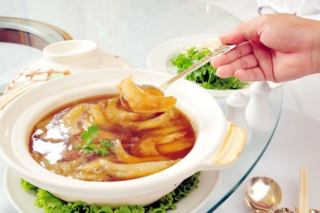 หูฉลามแผ่นน้ำแดง มาในหม้อดิน เปิดฝาออกมาควันฉุย ส่งกลิ่นหอมน่ารับประทาน อาหารจีนเวลายกเสริฟต้องรับประทานทันทีร้อน ๆ จึงจะได้รสชาติแท้ เพราะถ้าปล่อยให้เย็นแล้ว ถือว่าพลาดอย่างรุนแรง