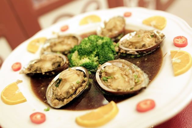 อีกเมนูที่ขอแนะนำคือ เป๋าฮื้อสดนึ่งกระเทียม เนื้อหอยเป๋าฮื้ออวบ ๆ ปรุงรสมาอย่างดี เสริฟมาเป็นคำ ๆ บนฝาหอยที่เรียงรายมาในจานเปลขนาดใหญ่ ของสดเหล่านี้ ไม่ว่ากุ้งมังกร หอยงวงช้าง เป๋าฮื้อ ล้วนเป็นสิ่งที่จำเป็นต้องนำเข้าทั้งสิ้น เพราะเมืองไทยเราเป็นเขตอบอุ่น ไม่ใช่ที่อยู่ของสัตว์น้ำรสอร่อยเหล่านี้ที่จะเติบโตได้อย่างสมบูรณ์ จึงต้องสั่งเข้ามาเพื่อให้ได้รสชาติที่สุดยอดจริง ๆ