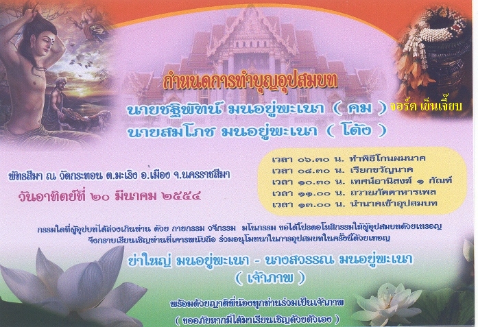 ในวันอาทิตย์ที่ 20 มีนาคม 2554 เวลา 13.00 น. ณ.วัดกะทอน ต.มะเริง อ.เมือง จ.นครราชสีมา