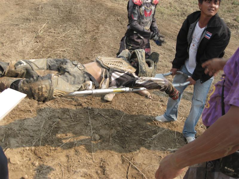 แล้วตอนล้มก็ไม่ได้ระวังตัว ขี่กลับจากซ้อม เอ้อระเหยชมวิวนี่แหละแล้วตอนนั้นมืดแล้ว ไม่ค่อยเห็นทาง ล้มตอนเลี้ยวโค้งทรายล้อหน้าจมทรายแล้วพับรถหมุนกลับ เอาขาขวายันโดยสัณชาตญาน พับแบบโอเว่น เลยเสียงดังครืดขึ้นถึงขมับเลย แต่ก็ขี่กลับได้ เพื่อนสตาร์ทให้ เจ็บพอทนได้คิดว่าไม่เป็นไรมาก ยังไม่ไปหาหมอ จนเกือบอาทิตย์ ไปหาหมอหมอบอกว่าน่าจะเอ็นฉีกก็ฉีดยาให้ยามากิน หมอคุยแบบว่าอาการไม่หนัก คงเห็นเราไม่แสดงอาการให้เห็น ก็กินยา ไปหาหมอ อยู่เรื่อยๆ เดินกระเผลกไม่ใช้ไม่เท้า ขางอแล้วก็ยังขี่รถอยู่ไม่หยุด ขางออยู่ ปีเต็มๆ ก็ไม่รู้ทำไงตอนหลังมาก็ตรงได้ แต่อาการปวด และ ติดขัดเวลาเดินก็มีอยู่อย่างนั้น จนทนไม่ไหวเลยตัดสินใจไปให้หมอผ่าตัดส่องกล้อง ซ่อมใต้หมอนรองกระดูกตัดเอาส่วนเกินที่ร่างกายซ่อมเป็นผังผืดออก ตอนนี้ก็ยังไม่รู้ว่าผลจะเป็นอย่างไรพักฟื้นอยู่