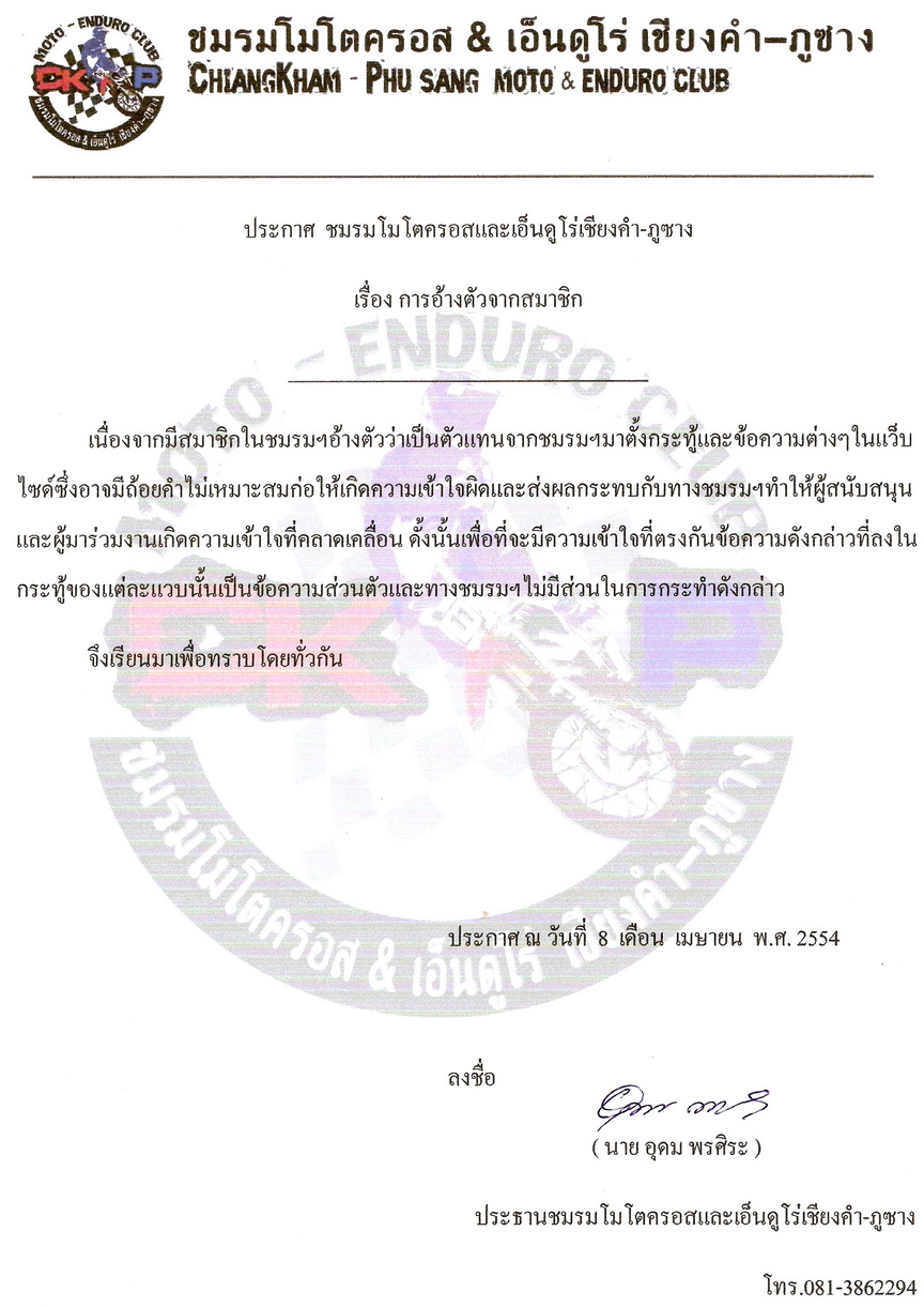 ประกาศ จากชมรมโมโตครอสและเอ็นดูโร่เชียงคำ-ภูซาง