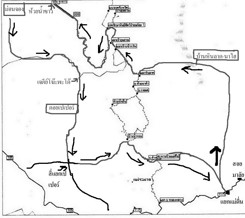 บันยายภาพที่ 16 บ้านตาก - แยกแม่ตื่น 50 กม. ทางดำ แยกแม่ตื่น - หินลาด นาไฮ(เส้นทางใหม่ พี่เต่า บ้านตากพร้อมทีมงานไปสำรวจมาเมื่อ 5 ก.พ.55 ประมาณ 50 เหมือนกัลล์ หินลาด - ห้วยน้ขาวก็น่าจะ 50-60 โล บวกลบ 10 ละกัน(แต่ยาวจริงๆ เส้นนี้ ไม่เชื่อถามทีมศรีราชาดูก็ด้าย) ห้วยน้ำขาว - ม่อนจองอีกไม่รู้กี่โล แต่มองเห็นด้วยตาเปล่า น่าจะไม่ไกลจนเกินไป ทางดำ บวกทางแดง ถึงม่อนจองรวบรวมข้อมูล วางแผน กิน นอน เที่ยว(อาจได้ขึ้นไปหัวสิงห์ ตอนเช้า(ผมคิดเอง)) แล้วค่อยออกสตาร์ท วันที่ 2 ผ่านมาทางเจดีย์โฆ๊ะพะโด๊ะ ผ่านเปเปอร์ สี่แยกเปเปอร์ เลี้ยวซ้าย ลัดเลาะไปตามเส้นทางครั้งแรกที่มาเปเปอร์ ไปโผล่บ้านน้ำหอม ทีนามู โบเก่ ออกแยกแม่ตื่น ถ้าเวลาพอ ก็เข้าทางแดงต่อไปดอย ภูกา ออก อ.เมือง ตาก กลับทางดำถึงบ้านตาก 20 โล กว่าหน่อย กร๊วบ!!!!!! ตามอัธยาศัย