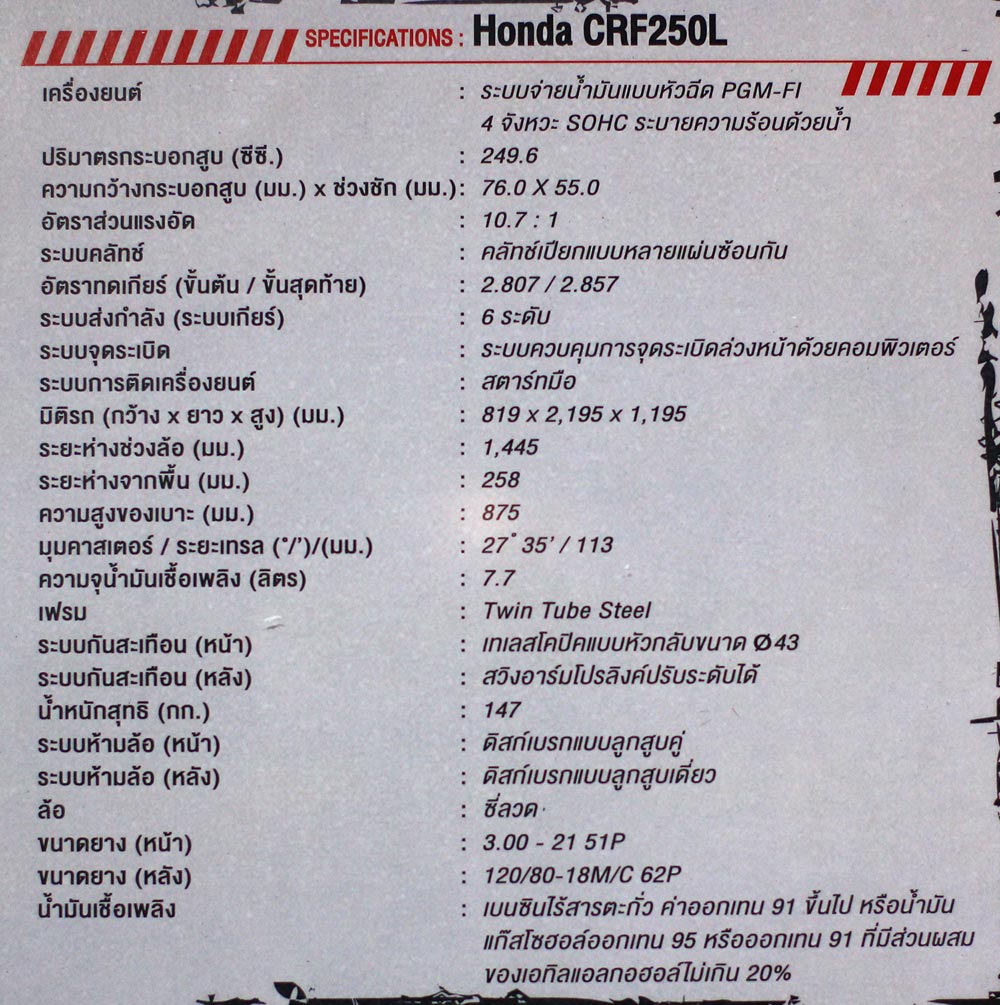 ที่แน่ๆ เครื่องยนต์ crf 250 l มีกลิ่นโรตีติดมาด้วยแน่ๆ อะไหล่มีขายตามร้านก๊วยเตี้ยวสองข้างทางแน่นอน แรงม้า 22 ตัว เครื่องยนต์ที่พัฒนามาจากรถโซนิก, cbr 150 จนลงตัว ระบบช่วงล่างแบบรถสูตรดีกว่าตัวxr แน่นนอน แต่ก็นั่นแหละ ก็ต้องใช้เวลาพิสูจน์ตัวเองอย่างรถตลาดทั่วๆไป แต่รถแนววิบากในบ้านเรา ก็เลิกสายการผลิตมานาน ที่จำๆได้ก็ mtx, mono,ts ก็มีแต่คาวาซากิ ที่ให้ตัวเลือก klx เท่านั้นในตลาดรถมีทะเบียนบ้านเรา แต่ที่แน่ๆเครื่องยนต์บล๊อคเดียวกับ cbr250 จึงเชื่อมั่นในประสิทธิภาพของเครื่องยนต์ได้แน่นอน ใครซื้อมาใช้รับรองไม่ผิดหวังแน่นอน ครับ