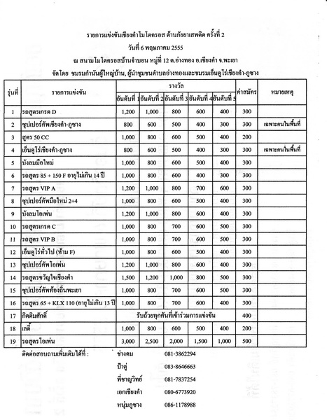 จ่ายเต็มทุกรุ่นไม่มีหักครับ แต่ต้องขออภัยเรื่องเงินรางวัลที่ดูน้อยไปนิดเพราะว่าเป็นงานการกุศลรายได้ทุกบาทไม่ต้องหักค่าถ้วยและเงินรางวัลและค่าใช้จ่ายอื่นๆ มอบให้กับกิจการ และการจราจร สภ.แม่เจดีย์ สอบถามเพิ่มเติม T. 086-3736437 อดิเรก
