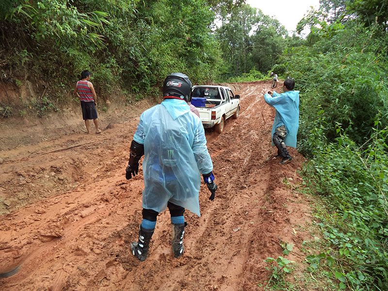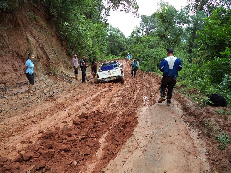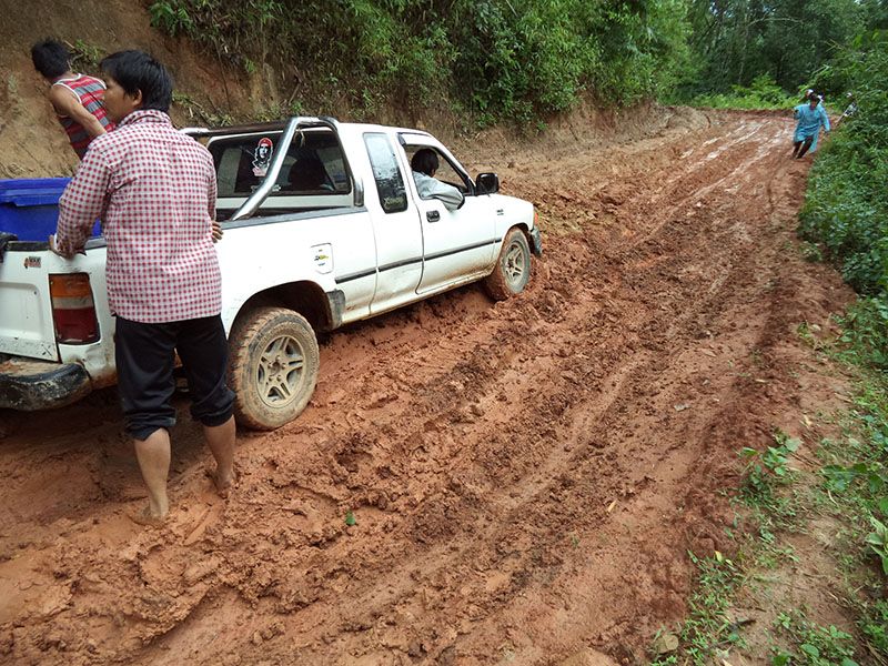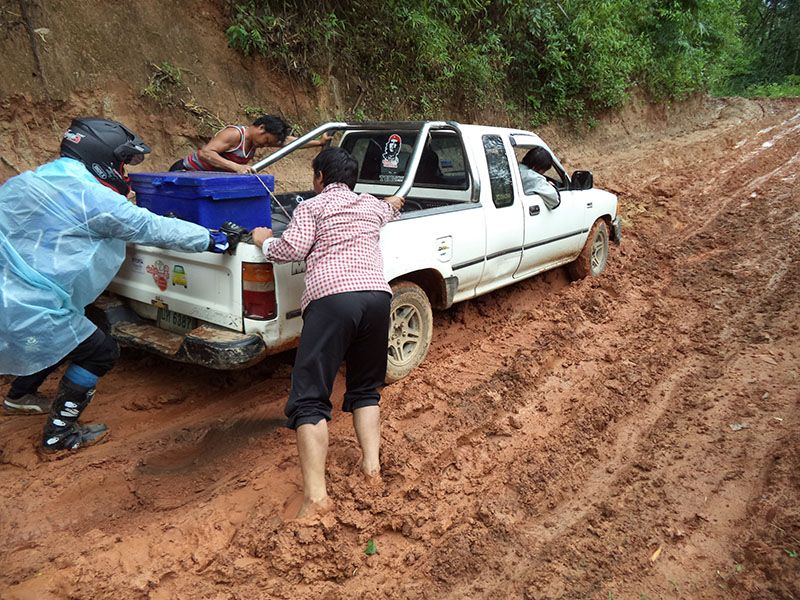 ท่ามกลางสายฝน เจอรถติดหล่ม ต้องช่วยกันจนออกไปได้...