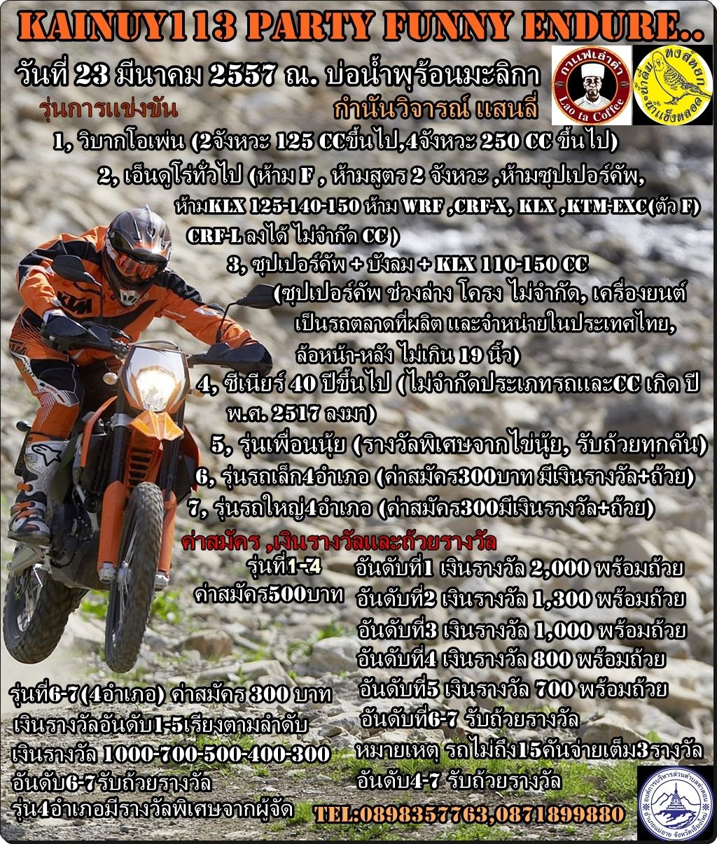 2, เอ็นดูโร่ทั่วไป (ห้าม F , ห้ามสูตร 2 จังหวะ ,ห้ามซุปเปอร์คัพ,ห้ามKLX 125-140-150 ห้าม WRF ,CRF-X, KLX ,KTM-EXC(ตัว F) CRF-L ลงได้ ไม่จำกัด CC )