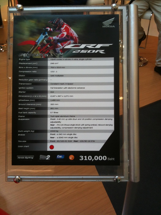 ฮอนด้าประเทศไทยจะ วางขายเดือน มีนาคม ที่จะถึงนี้ ราคายังไม่ทราบแต่น่าจะพอๆกับเคแอลเอกซ์ 250 ของคาวาซากิ คู่นี้ฟัดกันมันแน่ ดูเครื่องแล้วเหมือนจะยกมาจาก ซีบีอาร์ 250 นะครับ