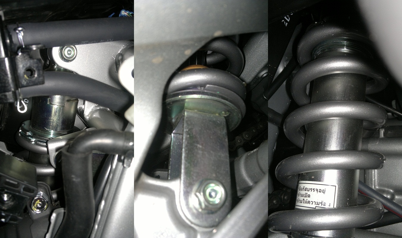 มาดูที่ระบบโช๊คหลังกันบ้างครับ เป็นโช๊คที่ไม่มีซับแทงค์ ไม่มีตัวปรับ ความแข็ง-อ่อน หรือ H - S และ รีบาวค์ มาให้ คงปรับไปแต่สปริงเพียงอย่างเดียว ( พอดีวันนี้ไปลองขับเล่นบนทางลูกรัง ) หากต้องการความนิ่มนวลกว่านี้คงต้องเปลี่ยนใหม่