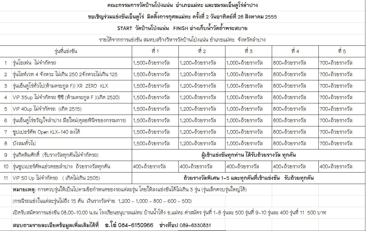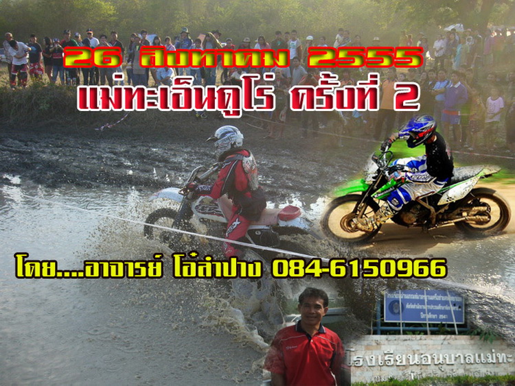 เชิญผู้สนใจเข้าร่วมแข่งขันเอ็นดูโร่ มิตติ้งการกุศล อ.แม่ทะ ครั้งที่ 2 วันอาทิตย์ที่ 26 สิงหาคม 2555 โดยกำหนดจุดสตาร์ทที่วัดโป่งแน่น และเข้าเส้นชัยที่อ่างเก็บน้ำวัดถ้ำพระสบาย อ.แม่ทะครับ....รายละเอียดติดต่อ อ.โอ๋ลำปาง 084-6150966 ช่างท๊อป 089-6330831 หรือ อ.อิ๊ดลำปาง 086-6785400