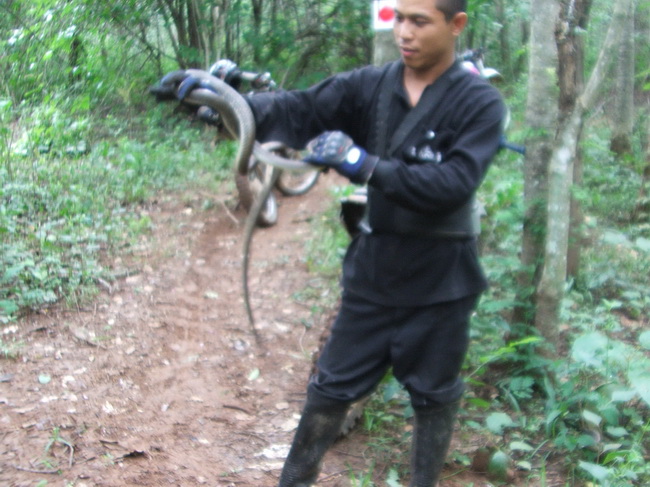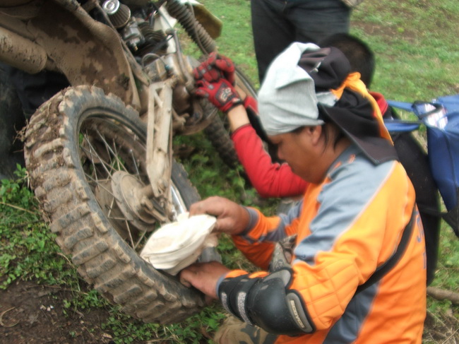 ส่วนนี่ก็หนึ่งในทีมงานของอ.โอ๋ที่ออกสำรวจเส้นทางล่าสุด รถยางรั่วครับ ใครมีผ้าเช็ดหน้า ผ้าขาวม้าก็ร่วมด้วยช่วยกันยัดเข้าไปแทนลม แหม...ยังขี่ต่อได้อีกครึ่งวันแนะครับพี่น้อง...สุดยอดของความระห่ำจริงๆ ..... .....พรุ่งนี้แล้วครับเราได้เจอกันเน้อพี่น้องงงงงง