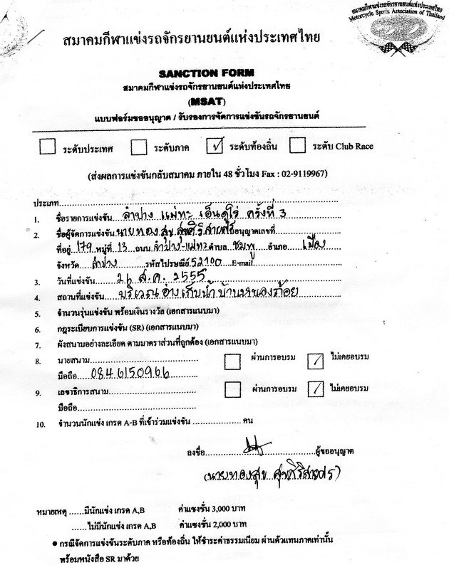 มาแล้วครับ....อ.โอ๋เอาแบบฟอร์มขออนุญาติ รับรองการจัดการแข่งขันของสมาคมกีฬาแข่งรถจักรยานยนต์แห่งประเทศไทยมาให้เดี๋ยวนี้แต่...บังเอิญเครื่องสแกนไม่อยู่ที่บ้านก็รอไว้ชมพรุ่งนี้ก็ละกันครับ...... ......เจ้าตัวฝากบอกมากันแต่เช้านะครับ..พี่น้องเราที่จะมาร่วมงานบุญเยอะครับ เฉพาะลำปางก็ 170 กว่าคันแล้วล่ะ... ...สนุกสนานแน่นอนครับ....ส่วนพี่น้องบ้านใกล้เรือนเคียงก็อย่าชล่าใจครับรถเยอะการจราจรคับคั่งก็ตื่นแต่เช้าๆก็ล่ะกันครับ.....ป๋าจวบ ป๋าจบ พะเยาก็เป็นหนึ่งในทีมงานคณะกรรมการครั้งนี้จะมานอนค้างพักแรมริมอ่างเก็บน้ำก่อนก็ได้ครับ หรือพี่น้องท่านใดสนใจที่พักโฮมสเตย์ก็บอกมาครรับ เดี๋ยวอ.อิ๊ดจัดให้พักที่สนามน้องอิมเกาะคาก็ล่ะกัน....