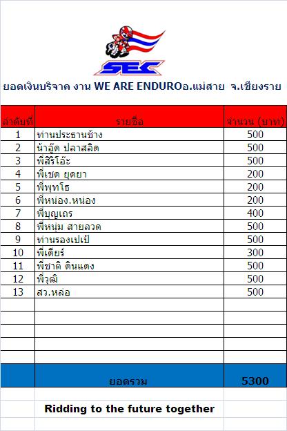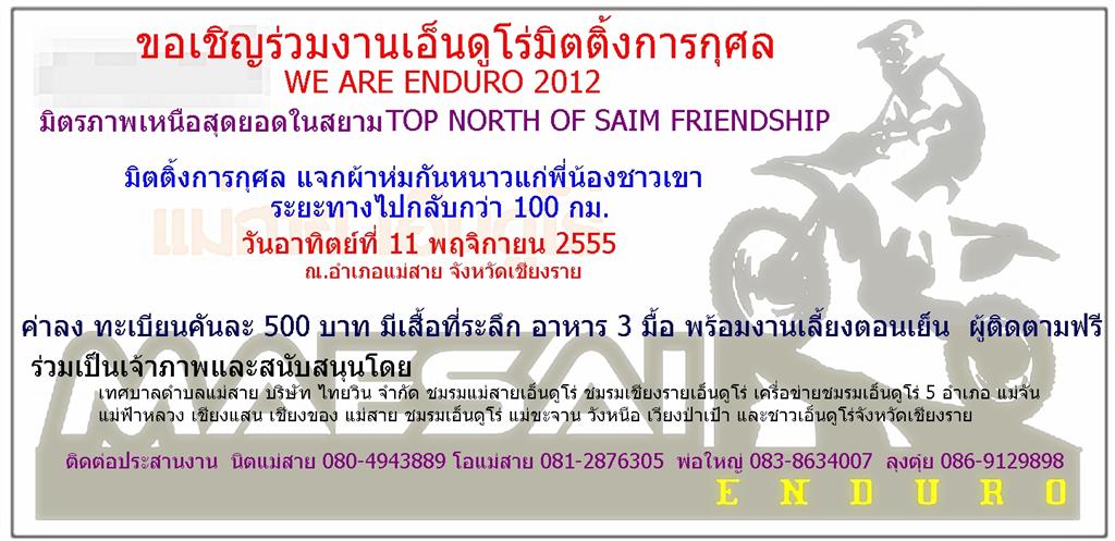 ชมรมเอ็นดูโร่แม่สายร่วมกับเครือข่ายชมรมเอ็นดูโร่ทั่วทั้งจังหวัดเชียงราย ขอเชิญร่วมงานมิตติ้ง we are enduro ประจำปี 2555 ในวันอาทิตย์ที่ 11 พฤศจิกายน 2555 เพื่อสงเสริมการท่องเที่ยวและต่อต้านยาเสพติด จึงขอเรียนเชิญกลุ่มเอ็นดูโร่ทุกกลุ่มทั่วทั้งเมืองไทย มาเที่ยวเชียงรายและแม่สาย พร้อมกับทำกิจกรรมคืนสู่สังคมร่วมกัน
