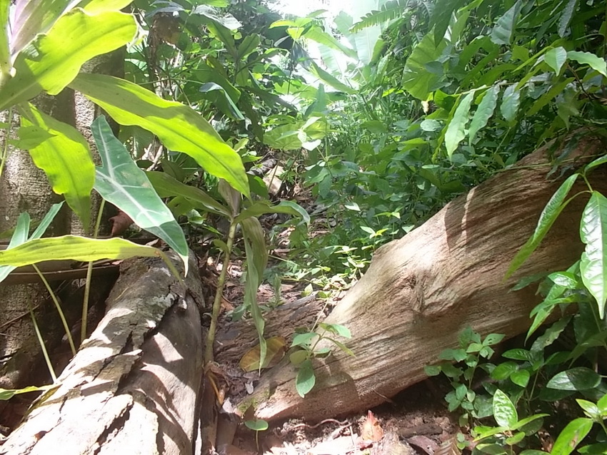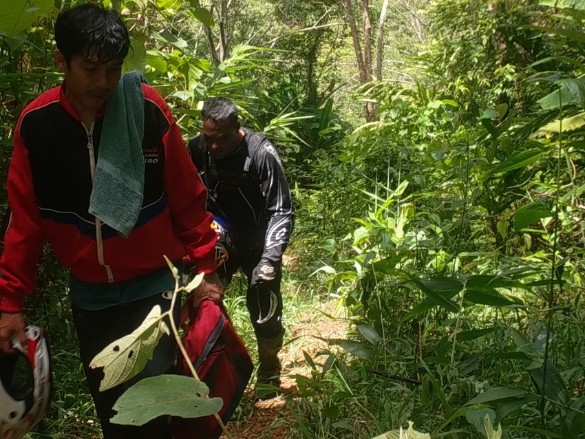 สงสารแกฯ เหมือนกันฯ พอขึ้นสันเขาได้...............ก็เป็นทางเปิดโล่ง แต่รกชะมัด เพราะมีแต่หญ้า และลูก ไม้ เล็ก ๆ ไม่รวมตอ แห้ง ๆ ที่ถูก ถางฯ.............แต่ไม่สำคัญ เท่ากัน มันเริ่ม ไต่ ระดับลง ๆ โดยพวกเรา ก็ไม่รู้ ว่ามันจะไป ถึงใหน? เพราะต่างก็ไม่เคยมา..................พอลงมาข้างล่างได้ ดูเหมือนแกงอนฯ แต่ จริง ๆ คงจะร้อนมาก.............