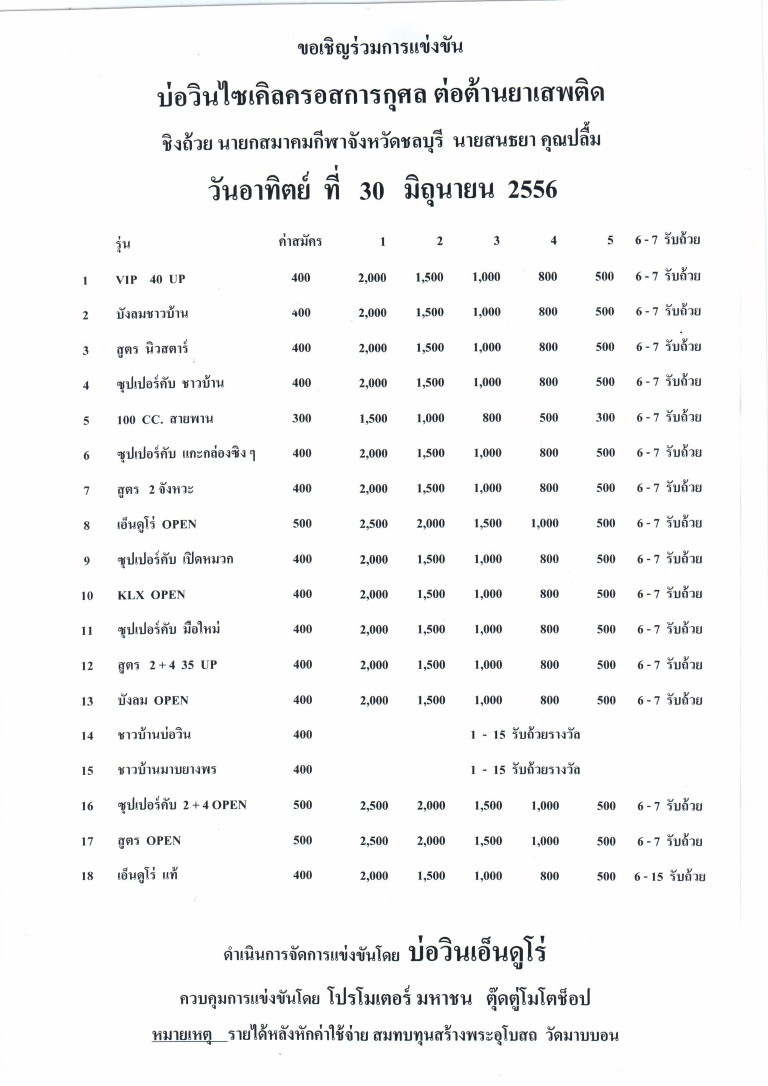 ขอเชิญชาวล้อหนามทุกท่านนะครับ เป็นงามการกุศลสมทบทุนสร้างพระอุโบสถวัดมาบบอน ชิงถ้วยนายกสมาคมกีฬาจังหวัดชลบุรี สอบถามได้ที่ 089-2449543 วัฒน์ 091-0140371 ช่างเบิ้ม