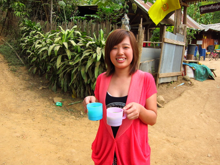 ก่อนจะถึงบ้านแม่ก๋าเรามาแวะดื่มน้ำเย็นที่บ้านแม่พร้าวโดยมีน้องๆน่ารักเอาน้ำเย็นชื่นใจมาเสิร์ฟถึงมือทุกๆคน แต่ผมยังไม่อยากขึ้นไปเลยเพราะว่า....
