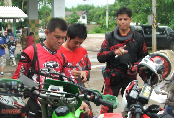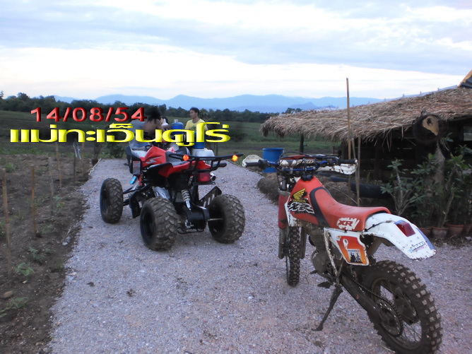 "อาจารย์โอ๋+อาจารย์อิ๊ด สิ้นฤทธิ์ข้างทางรถไฟแม่ทะ...555 555+"..... .....จั่วหัวซะน่ากลัวครับ ก็เป็นเบื้องหลังการสำรวจ S โชว์เส้นทางช่วงสุดท้ายตามที่แอร์บาวได้แจ้งไว้ หลังจากเช็ครถแล้วก็เปลี่ยนกันขี่ครับ ผมนำเจ้า XR ของอาจารย์โอ๋ออกเดินทางล่วงหน้า ตามด้วยน้องอิม และแอร์บาว ...ส่วนอ.โอ๋ ใช้ ATV คันงามของท่านสจ.เมื่อสำรวจเส้นทางเสร็จก็จะกลับมาประชุมกันต่อ โดยผมออกเป็นค้นสุดท้าย....เจ้ากรรม ..ตกใจนกบินตัดหน้า หักหลบตรงปากท่อระบายน้ำของทางรถไฟพอดี ก็เลยได้เห็นตามภาพต่อไปนั่นแหละครับ ตกลงไปในลำห้วยลึกประมาณ 3 เมตรโดนรถกระแทกซะซี่โครงหักไปหนึ่งซี่ และโดนพักเท้าทิ่มขาซะเลือดสาด..เดือดร้อนคุณหมอจากรพ.เขลางค์ซะเลยนิ เดชะบุญยังมีต้นไม้คู่นึงเบรครถไว้ไม่ให้กระแทกเต็มหน้าอกไม่งั้นมีหวังหมดไปหลายซี่... หลังจากที่คุณพ่อหายไป น้องอิมขับกลับมาดูเห็นพ่ออยู่ในลำห้วยก็ไปตาม อ.โอ๋ก่ะแอร์บาวมาช่วย เจ้าพ่ออย่างอ.โอ๋ก็โดนไส้เดือนวิ่งตัดหน้าอีกครับ ATV คันงามก็ลงไปในลำห้วยเหมือนผมเลยชนิดที่ไม่ยอมน้อยหน้า มาด้วยกันก็ตกด้วยกัน... เดือดร้อนคนงานท่านสจ.ต้องมาช่วยกันหมดสวนเลย...ติดตามชมภาพเด็ดๆได้เลยครับ
