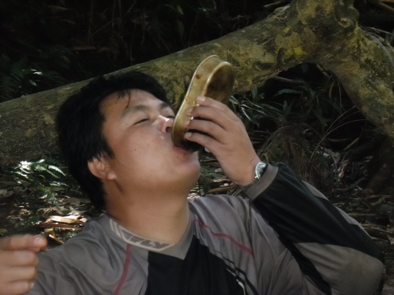 ผมจึงนำทางลงสู่แม่น้ำสุริยะ แล้วลงช่องเขาเลียบหน้าผาทางชันมากลงสู่เบื้องล่าง เป็นลำธารสายเล็กๆไปเจอรอยรถเอ็นดูโร่เก่าของกลุ่มฝรั่ง4คนที่ไปเที่ยวเลตองคุเมื่อวันศุกร์ที่ผ่านมาข้ามไปฝั่งจังหวัดตาก ที่จริงผมก็ไม่แน่ใจว่าลำธารนั้นคือแม่น้ำสุริยะ พอดีหันไปเจอพระธุดงค์กับลูกศิษย์กระเหรี่ยงคนนำทางเดินมาจากฝั่งจังหวัดตากเพื่อไปอำเภอสังขละบุรี ผมจึงสอบถามพระ ได้ความว่านี่คือแม่น้ำสุริยะของแท้ แต่ด้านล่างแม่น้ำจะใหญ่กว่านี้ต้องลงไปอีกประมาณ1กม. แล้วไปหมู่บ้านเลตองคุ อ.อุ้มผาง จ.ตาก อีกประมาณ20กม.