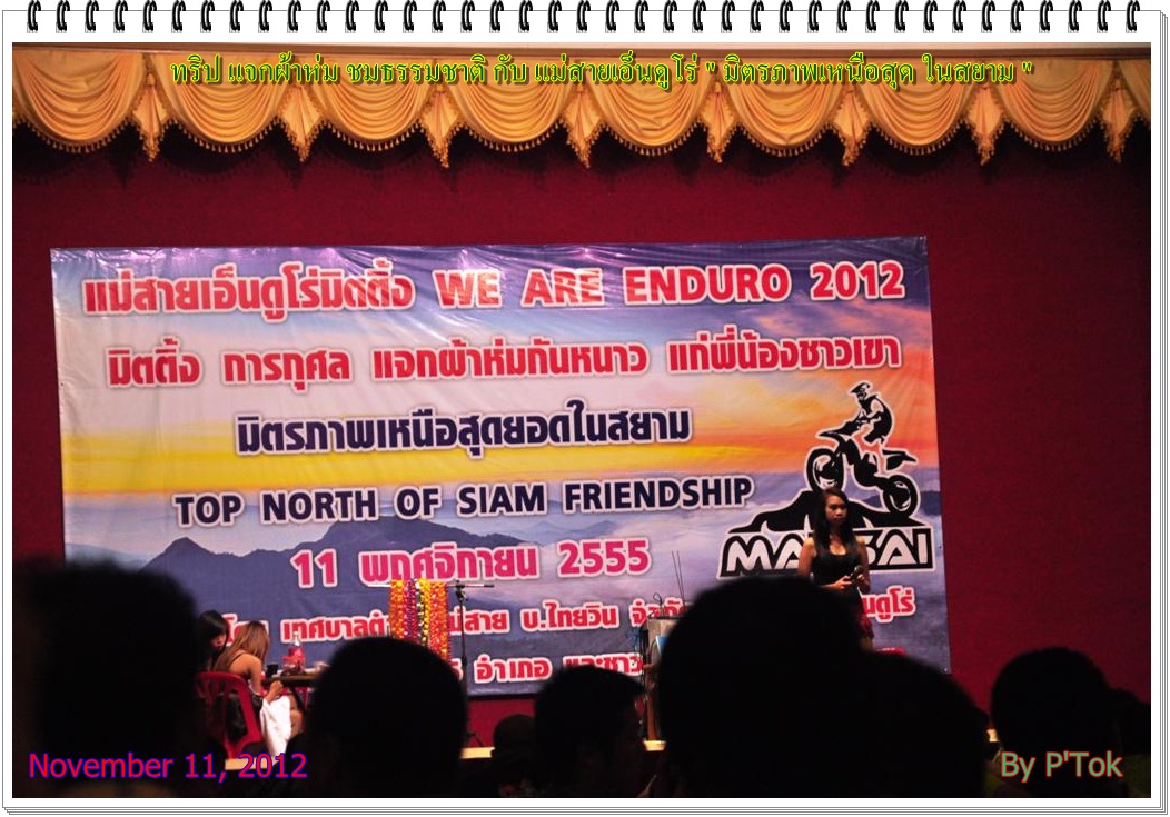 สำเร็จลุลวงไปด้วยดีกับมิตติ้งการกุศลแจกผ้าห่มแก่พี่น้องชาวเขา กับยอดบริจาคมากมาย ในนามเจ้าภาพต้องขอขอบคุณพี่น้องชาวเอ็นดูโร่ทั่วไทยที่มาช่วยกันอย่างอุ่นหนาฝาครั่ง ทำให้งานสำเร็จไปด้วยดี ขอบคุณทีมเซอร์วิสผู้อยู่เบื้องหลังความสำเร็จ เจ้าหน้าที่เทศบาลแม่สาย อีซูซุสงวนไทย พี่อู๊ดแพร่ พี่เต๋าดอย พี่ต้นพี่แซม พิษณุโลก โกแซว โกฟัดกลุ่ม 4x4 ลุงตุ๋ย พ่อหลวงตามดอยต่างๆ และอีกหลากหลายท่านที่ไม่สามารถเอยนามได้ทั้งหมด ที่แนะนำการเตรียมงานเป็นอย่างดี และต้องขอขอคุณเป็นพิเศษ พี่จอร์ด ที่ช่วยตั้งแต่เริ่มจนจบงาน และขอบคุณเป็นพิเศษอีกคน โกตู่ แม่สาย สปอนเซอร์หลักของงานนี้ ถ้ามีอะไรที่ทางเจ้าภาพทำได้ไม่สมบูรณ์ต้องขออภัยมา ณ โอกาศนี้ครับ