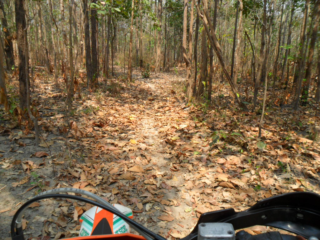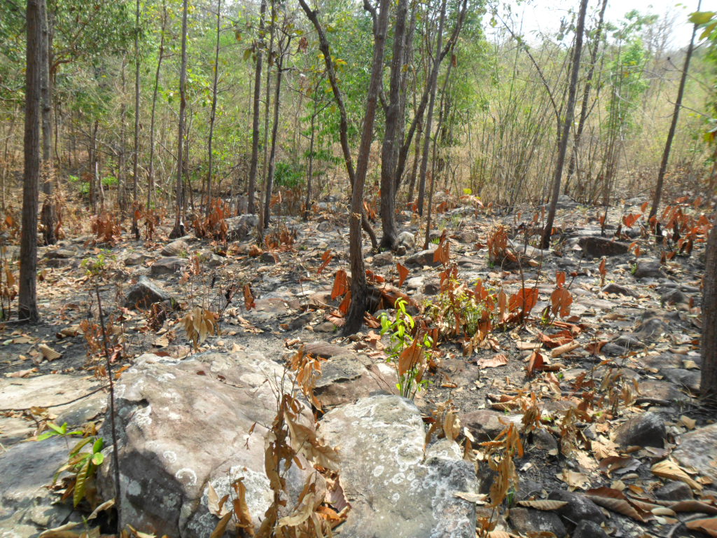 หน้าแล้ง ใบไม้ร่วงลงปกคลุมหินไว้เบื้องล่าง อาจทำให้กลิ้งได้ถ้าไม่ระวัง