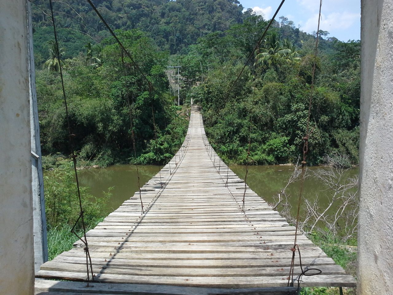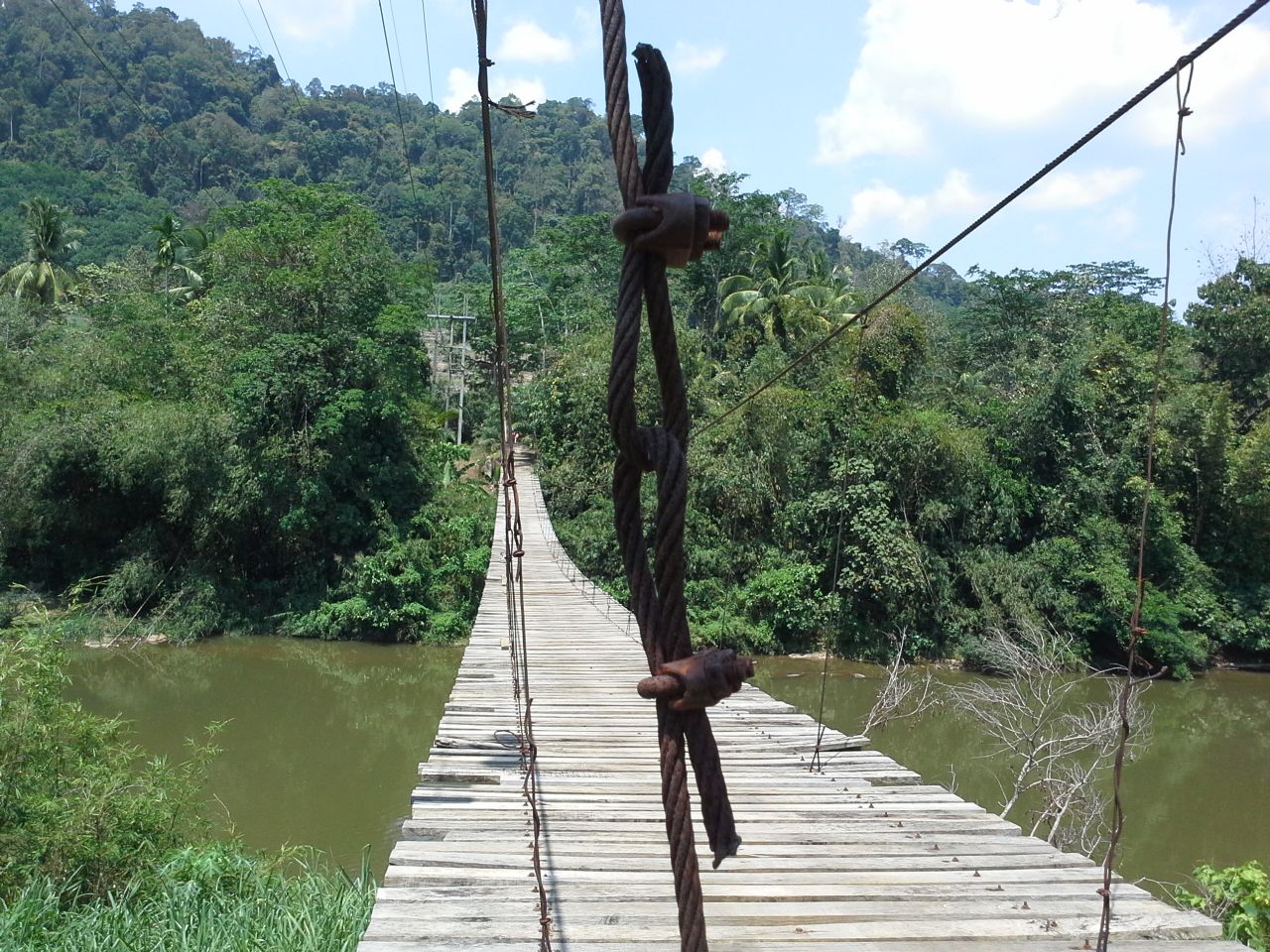 จะว่าไปแล้ว สะพาน สลิง ที่นี่ แตกต่าง จากที่ผมเคย เห็น ในที่ อื่น ๆ เท่าที่ ประสพการณ์ อันน้อยนิด ของผม ได้เห็น มาในหลาย ท้องที่ ของประเทศ คือฯ......มันเว้น ระยะ ห่างกว่าปกติ แถม หนำซ้ำ ไม่ มีลวดฯถัก เป็นราว กันตกไว้ เซฟฯ คนและรถ เอาเสียเลย!......