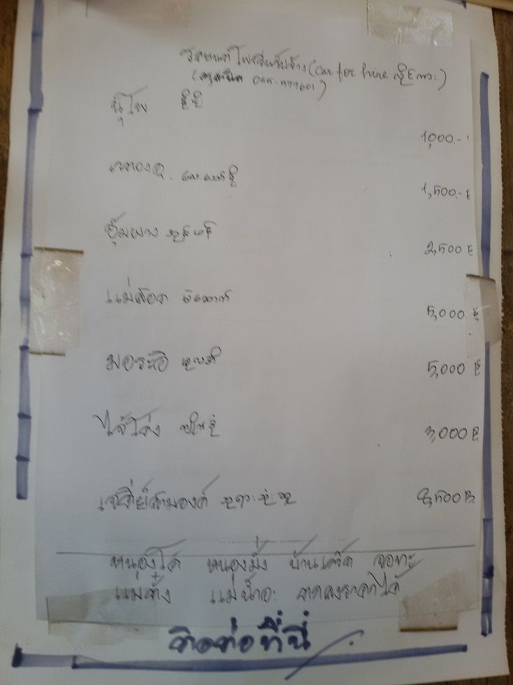 อัตราค่าเช่ารถที่ร้านก๋วยเตี่้ยว บรรทัดล่างสุด 8,500 บาท คือเส้นทางที่วิ่งผ่านมาครับ ใครอยากไปเส้นทางนี้ ลองใช้บริการดูครับ แต่ถ้าจะขับรถไปเอง ลองพิจารณากันเองแล้วกัน เพราะมีด่านที่ฝั้งโน้นอยู่หลายด่าน ครับ