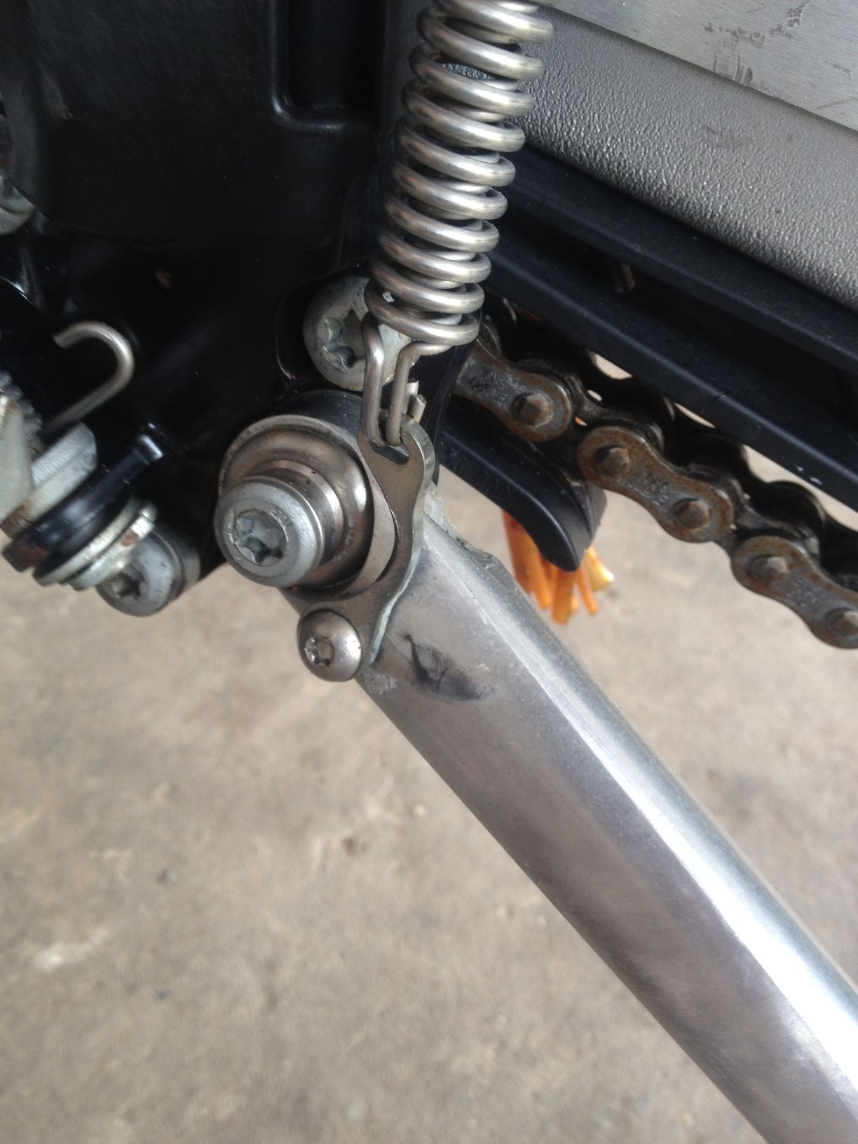 อีกจุดอ่อนของน้องส้ม ตัวรั้งสปริง มักหล่นหาย เพราะน๊อตยึดที่ยึดกับขาตั้งมันคลายตัว ของผมต้องไปกลึงใหม่ แต่ไม่ยากเท่าไร เซ็งเล็กน้อย ดีนะที่เขาออกแบบมาโดยมียางรั้งขาตั้งสำรองไว้