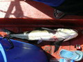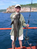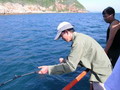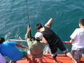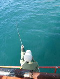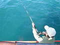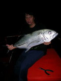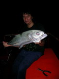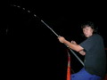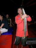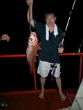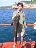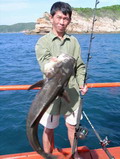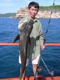 ขณะที่ท้ายเรือกำลังเมามันกับฝูงฉักฮื้อ อยู่นั้น คันเบ็ดที่ปักทิ้งไว้ท้ายเรือ ก็โค้งวูบลง เฮียคิมเป็นผู้ที่ยืนอยู่ใกล้คันมากที่สุด จึงถือโอกาสเป็นผู้อัดปลาตัวนี้สะเลย เฮ้ย ไอ้เก๋า ใหญ่ เสียงเอ๊ะ อะ มะเทิ้ง ดังขึ้นเมื่อ เราเห็นปลาที่เฮียคิมอัดนั้นเป็นปลาเก๋า ที่หาตัวได้ยากมากในน่านน้ำ แห่งนี้ เย้.....โคตรฟลุ๊กเลยตู เฮียคิมถึงกับยิ้มแก้ม ตุ่ยกับปลาเก๋าตัวนี้ มันมีนำหนักเกิน 2 กิโล และเป็นแต้ม ที่ 3 ที่เราในคืนนี้