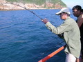 เมื่อเรือเราโดนลากมาถึงจุดหมาย นายตั้มก็เกี่ยวหมึกแล้วทิ้งลงท้ายเรือทันที เอ๊ะ ทำไมยังไม่ถึงพื้นอีกเหรอครับตั้ม สีชาถาม เมื่อเห็นว่านายตั้ม หย่อนสาย นานผิดปกติ ยังเลยครับ ยังไม่ถึงพื้นเลย นายตั้มตอบ สงสัยปลาจะกินแล้วมั้ง ดูสิ สายเอ็นไหล ไปอยู่ท้ายเรือลำโน้นก็สั่น ดิ๊ก ดิ๊ก ท่าจะติดปลาแล้วละแบบนี้ สีชากล่าว ในขณะที่นายตั้มกัดฟันปั่นรอกกรอสายเข้ามาอย่างยากลำบากขึ้น มีอาการดิ้นร่น ขัดขืนเกิดขึ้นเสียแล้ว ไต๋ยอช์ต พอได้ยินว่าท้ายเรือกำลังอัดปลาใหญ่อยู่ก็เดินมาดู ไอ้เกย สะละม้างแบบนี้ ไต๋ยอช์ตกล่าว ในที่สุดปลาที่แอบมากินเหยื่อเรา ก็ลอยตุ๊บป่องสู่ผิวน้ำ ทันที ที่ได้เห็นเกล็ด และรูปพรรณ สันฐาน พวกเราก็รู้ได้ทันทีว่ามันคือ ไอ้เกย ไอ้เกย ตัวใหญ่ด้วย แต่พอเราช้อนมันขึ้นมาบนเรือแสงไฟ บนเรือจึงทำให้เรารู้ว่ามันคือปลาแดงเขี้ยว และมันก็เป็นแต้มที่ 5 ของเรา แถมยังคว้ารางวัลชนะเลิศ ประเภทปลากะพง เสียด้วย