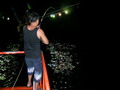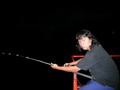 เวลาผ่านไปไม่นานไฟแสงสว่างจากดวงไฟก็เปล่งแสงสว่าง นั้นแสดง ว่ากิจกรรมเปิดไฟไดร์หมึกหาเหยื่อ อุบัติขึ้นแล้ว พวกเราบนเรือต่างคว้าชุด โยทะกา มาหย่อนลงน้ำแล้วชักขึ้นชักลง ไม่นานนัก หมึกกล้วย ขนาดกำลังดี ก็มาจับโยทะกา ขณะเดียวกันพี่ตึ๋งกับเฮียคิม ก็ลงสายกลางน้ำเล่นปลาสากไปพร้อมๆ กับการหาเหยื่อไปด้วยและเราก็โชคดี มีปลาสาก ถึง 2 ตัวเข้ามางาบสายที่เราลงไว้ เรามีปลาเกมส์มาตุนในกระเป๋าแล้ว 1 แต้ม แต่แล้วเกมส์หาหมึก ทำเหยื่อ ดำเนินไปอย่างสนุกสนาน ก็ต้องมาสะดุดหยุดลงเมื่อมีแขกที่ไม่ได้รับเชิญเข้ามาแหวกว่ายไล่งับ ลูกปลาและไล่งาบหมึก แขกที่ไม่ได้รับเชิญนี้ก็คือ ปลาดาบลาว ตัวยาวเกือบศอก แสงสีเงินยวงจากเกล็ดของมัน สะท้อนแสงไฟอยู่ใต้น้ำวาววับ เต็มพื้นน้ำไปหมด นี่แหละตัวต้นเหตุที่ทำให้หมึกหายหน้าไม่ยอมมาไล่เกาะโยทะกา ไต๋ยอช์ต ปลาดาบลาวเต็มไปหมดเลย หมึกไม่กล้าอยู่หรอก เอาสุ่มครอบ กำจัดมันก่อนดีกว่า สีชาเสนอ ไต๋ยอช์ต พยักหน้าเห็นดีด้วย และการหรี่ไฟครอบในครั้งนี้ ทำให้เราได้หมึก ไม่ถึง 50 ตัว แต่ได้ปลาดาบลาว ตั้ง 1 ตระกร้า และมันก็กลายมาเป็น ทอดมันปลาดาบลาว ที่เนื้อเหนียวนุ่มและสุดแสนจะอร่อย ในวันรุ่งขึ้น