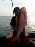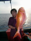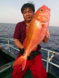 จากตะวันยามเช้าสู่ตะวันบ่ายขณะที่ เรือ Ocean One Ranong วิ่งไปยังหมาย นุ ตรงนี้น่าสนใจ แวะหย่อนเหยื่อลองดูดีมั๊ย พี่ซิง ที่นั่งมองดูจอ Sounder เห็นความเปลี่ยนแปลง ของภูมิศาสตร์ ใต้ทะเล จากระดับความลึก 500 เมตร ขึ้นมาเหลือ 200 เมตร และ 40 เมตร ลักษณะที่เป็นระดับ ขั้นบันไดแบบนี้แหละ มันน่าจะมีปลามาอาศัยอยู่มากมาย ได้ครับเดี๋ยววนเรือหาเชื้อดูสักรอบก่อน ถ้ามีเชื้อก็หย่อนเหยื่อได้เลย ไต๋นุกล่าว ก่อนจะหมุนพังงาวนเรือตรวจหาเชื้อ เอ้า หย่อนเหยื่อกันได้ เจ้าเก๋ร้องตะโกน เมื่อเรือลอยลำเคลื่อนตัวผ่านหน้าผาที่ระดับความลึก ที่ 200 เมตร มะ มี มีปลา ด้วย ครับพี่ นายวิทยา พูดตะกุกตะกัก ในขณะที่สองมือโน้มคันที่โดนปลาดึงจนคันโกร่ง หัวเรือ นายหมึก ก็โดน อ้าว น้าป้อ พี่ซิง พี่ชาญ เฮียคิมก็โดน อุ้ย โดนกันหมดทุกคนเลยนี่หว่า ฮะ ฮา เจ้าเก๋กล่าวด้วยความสะใจ ยามนี้คณะสำรวจเจอกับเหตุการณ์ที่ไม่เคยพบเห็นมาก่อน เหล่าปลาแดงสีทองจำนวนมากมายมหาศาล รุมล้อมพวกเราอย่าง หืนกระหาย และจะเข้ากัดกินทุกสิ่งที่ร่วงหล่นลงน้ำ ทันทีที่มันเห็น โอ๊ะ นี่เราอยู่ในวงล้อมของฝูงแดงสีทองหรือนี่ พี่ชาญ อุทานออกมา เมื่อมองดูซากปลาที่กองอยู่ที่หัวเรือและท้ายเรือ อ้าวพี่ซิง โยกคันขึ้นลงหน่อยสิพี่ อย่าวางคันพิงราวเรืออย่างนั้น พี่ชาญกล่าวเมื่อเห็นพี่ซิงไม่โยกคัน พักเหนื่อยหายใจก่อนครับ มันเหนื่อย ปลากินเหยื่อไม่ให้หายใจหายคอกันเลย พี่ซิง โอดโอย ปลาอยู่ที่ระดับ 40 เมตรครับ นายเก๋ขานระดับความลึกที่มีเชื้อปลาปรากฏที่จอ Sounder พี่ซิงพอได้ยินตำแหน่ง ความลึกของปลา ก็เริ่มนับแถบสีของสาย PE ที่จะแบ่งสีออกเป็นทุกๆ 5 เมตร พี่ซิงครับ ปลาอยู่ที่กี่เมตรนะครับพี่ นายไก่ ก่อสร้างเอ่ยปากถามพี่ซิง 40 เมตรครับ เอ้า ลืมเลยตู ปล่อยสายไปกี่เมตรแล้ววะ พี่ซิงบ่นกระปอดกระแปรด เอามือเกา หัวแกรกๆ เพราะเจ้าไก่ดันมาถามเลยลืมไปว่าได้โรยสายไปกี่เมตรแล้ว ต้องเสียเวลาเอาเหยื่อขึ้นมาปล่อยลงไปใหม่ ส่วนพี่ชาญ สบายหน่อยเพราะใช้รอกที่มี Counter ไม่ต้องมาเสียเวลามานั่งนับสีของสาย ปลาจะอยู่ที่ระดับความลึกเท่าไหร่ พี่ชาญ ส่งเหยื่อลงไปหาได้แม่นยำทุกตัว