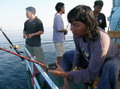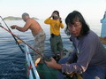 หลังจากเกมส์การต่อสู้ที่ดุเดือนเหงื่อท่วม ผ่านไปนานนับชั่วโมง ก็ปรากฏวัตถุสีน้ำตาลอ่อน ขนาดมหึมาในระดับความลึกไม่เกิน 20 เมตรโผล่ให้ได้เห็นพอรางๆ ขึ้นมาแล้ว มันขึ้นมาแล้ว ครับพี่ใหญ่ โอ้ โห ปลายักษ์ ครับพี่ ปลายักษ์ เสียงนายวิทยา พอเห็นขนาดของมันก็ร้องตะโกนดังลั่น เสียงของวิทยาดังไปกระตุ้นต่อมความอยากรู้อยากเห็นของเพื่อนๆ ให้ปรี่มามุงดูปลายักษ์ตัวนี้อีกครั้ง สภาพของคนตอนนี้เปียกชุ่มไปด้วยเหงื่อที่ไหลออกมาจนท่วมตัว เฮ้ย ! ไอ้หลาม ครับไอ้หลาม ร่วม 100 โล แน่ะ ตะ ตะ ตะ ตัดสายหน้าเลย เจ้าเก๋ เมื่อเห็นเรือนร่างของมันถนัดตา รีบร้องขอคีมตัดสายทันที เท้ง โว้ย เท้ง เอาคีม มา ตะ ตะ ตะ ตัด สายหน่อย เจ้าเก๋ ร้องเรียกย้ำอีก ครั้ง อารายวะ พอเห็นเป็นปลาฉลาม ถึงกับติดอ่าง เลยรึวะเก๋ ฮ่า ! พี่ซิงได้ที เอ่ยปาก แซวนายเก๋ ไปสะ 1 ดอก ปล่าวพี่ กฎของพม่าห้ามนำปลาฉลามขึ้นเรือใครเอาขึ้นเรือโดนปรับ 2 แสนเชียวน่ะพี่ นายเก๋รีบอธิบายกฎกติกาให้คณะทราบทันที