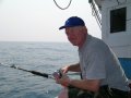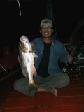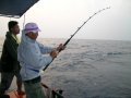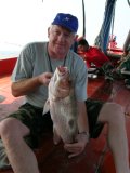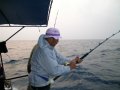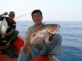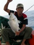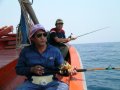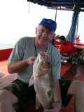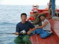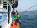 อรุณเช้าวันใหม่ ในวันที่ท้องฟ้าสดใส อากาศเย็นสบายสุดสดชื่น ความรู้สึกมันช่างแตกต่างกับอากาศในเมืองอย่างสิ้นเชิง เสียงเครื่องยนต์เรือ ยังคงดังกระหึ่ม หัวเรือแหวกพื้นน้ำแตกกระจาย ทำให้ปลานกกระจอกตกใจ กระโดดบินถลาเหินลม ตัดกับสีฟ้าครามของผิวน้ำทะเล ตี๋ใหญ่ กำลังจะพาพวกเรา ไปยังหมายหินกอง ที่อยู่หลังเกาะรัง ด้วยหวังเพื่อจะตกปลาเก๋าลูกหมูอวดฝรั่งให้ได้ชมเป็นขวัญตาว่าเมืองไทยของฉันก็มี อีฟายเฟนลุ๊ค ตัวใหญ่ (ปลาเก๋า) ไม่แพงต่างประเทศเหมือนกัน พอเรือไปถึงหมายกองหิน ตี๋ใหญ่สั่งให้เด็กเรือทิ้งสมอ แล้วใส่เกียร์ถอยหลังเข้าหาจุดหมายกองหิน สายสมอตึง หมึกเป็นตัวใหญ่ถูกช้อนขึ้นมาจากห้องขัง ก่อนจะบรรจง ฝังตะขอเบ็ดลงไปยังใต้ผิวของมัน สายเบ็ดถูกหย่อนลงสู่พื้นด้านล่างเวลาต่อจากนี้ไปแต่ละคนจะใจจดจ่อ อยู่ที่ปลายคันเบ็ดของตัวเอง โดยเฉพาะ สินกับเอ้ เด็กหนุ่มจาก อำเภอวังน้อย อยุธยา ที่มาลงเรือเที่ยวนี้กับเราด้วย รู้สึกจะไม่ละสายตาห่างจากปลาคันเลย "อึ๊บบบบ วู้...ติดแล้วโว้ย ฮ่ะฮะฮ่า " เสียงเจ้าสิน ร้องตะโกน ออกมาด้วยความดีใจ เมื่อเหยื่อหมึกของตัวเองโดนปลาสวามปามเข้าให้แล้ว ปลามันดึงคันเบ็ดของสิน โค้งวูบ ก่อนที่ สิน จะวัดคันสวน "ปลั๊ก เข้าให้ เสร็จตู ละเมิ้งหวานคอแร้ง ตูละ" เสียงของสิน ตะโกนออกมาด้วยความดีใจ สะใจกับ ปลาเปิดเกมตัวแรกของทริบนี้ และเพียงไม่กี่อึดใจ ปลาเก๋า ไซร์ กำลังน่าหม่ำ ก็ถูกสินดึงขึ้นมานอน พุงป่องบนผิวน้ำ และเมื่อปลาเริ่มกินห่างตัว เราจึงต้องย้ายหมาย ไปยัง หมายกองหินข้างเกาะกูด ระหว่างที่ย้ายหมาย ผมหยิบเอา เหยื่อลากปลาบินของพี่หมูโอเชี่ยน ออกมาปล่อยสายลาก เพื่อจะหาปลาโอ มาทำ ซาซิมิ กินสักตัว 2 ตัว พอปล่อยสาย เซ็ตแดรกเสร็จได้ไม่ถึง 5 นาที เสียงรอก Shimano TI16 ก็แผดเสียงดังสนั่นลั่นเรือ คัน Fenwick IGFA 20 ปอนด์ โน้มตัวตามแรงดึงของสายเอ็นที่ไหลออกจากรอก สมาชิกต่างกรู่กันวิ่งมาท้ายเรือ มองหาจุดต้นต่อของเสียง นายเอ้ รับอาสา ปิดเกม รับคันไปกรอสายเก็บเข้ามาและแล้วปลาโอ 2 ตัว ที่หลงมางาบเหยื่อปลาบินของพี่หมูโอเชี่ยน ก็มีอันต้องแปรสภาพ เป็นปลาดิบไปใน อีกไม่กี่นาที แหม! ขณะที่เรากำลังเพลินกับของเล่นชิ้นใหม่ ตี๋ใหญ่ ก็พาเรือ มาถึงหมายกองหินเสียแล้ว เราจึงต้องพักเรื่องเหยื่อปลาบินไว้ก่อน หันมาคว้าคันตกปลาหน้าดินกันต่อ Mr.Kane หลังจากที่หมายแรก ได้แต่วัดคัน วัดลม วื้ด ไป วื้ดมา ไม่ได้อัดปลาสักตัว เพราะพี่ท่านจับจังหวะปลากินเหยื่อไม่ถูก มาหมายนี้จึงต้องมีการแนะนำเทคนิค สอนจังหวะการวัดคัน ให้พี