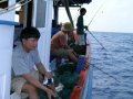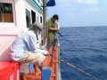 ลุกขึ้นมาคว้าคันเบ็ด แล้วไปเกี่ยวหมึกตายหย่อนข้างกาบเรือ เพียงไม่นานคันของนายหนุ่มการบินไทย