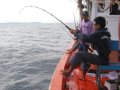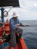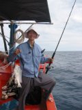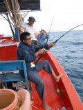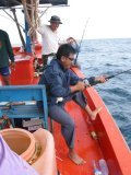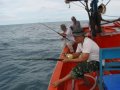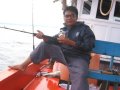 คันชุดหมาน ของผมลงเบียดได้เลย ตี๋ใหญ่ ก็เลยปักคันของผมไว้ตรงท้ายเรือปล่อยให้ปลาเหยื่อว่ายน้ำ
