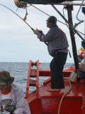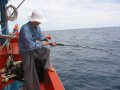 คันเบ็ดในมือปู่ต้อม ที่นั่งโสกหมึกอยู่ข้างผม ก็โค้ง ลงจรดผิวน้ำ ปู่ต้อมถึงกับร้องเสียงหลง