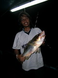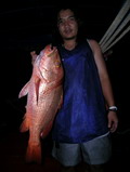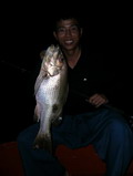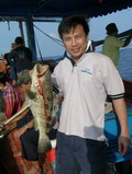 งานนี้ ฝ่ายทีม หมูหัน เรือไต๋วุฒิ ได้แจ้งสถานการณ์มาว่า ไปแงะเอาอังเกยยักษ์ ไซร์เกือบ 10 กิโลกรัม ขึ้นมาหลายตัวแล้ว เล่นเอาคนที่ได้ยิน อิจฉาตาร้อนไปตามๆ กันส่วนทีม ละอ่อน น้องใหม่ที่พึ่งจะตกปลาทะเลเกือบจะทั้งทีม ทำท่าว่าจะไปได้สวย เมื่อคุณตั้ม ที่พึ่งจะจับคันเบ็ดตกปลาทะเลเป็นครั้งแรกเป็นผู้เปิดประเดิม ทริบด้วยปลาเก๋า ไซร์ เกือบจะ 4 กิโลกรัมขึ้นมา จากนั้นก็โดนลองของอีก 1 ดอก เมื่อโดนปลาเก๋าลูกหมู งับเบ็ดเล่นเอามือใหม่ที่พึ่งจะ เปิดจุก สดๆ ซิ่งๆ ทำอะไรไม่ถูกได้แต่ถือคันรั้งอย่างเดียว จนในที่สุด มันก็พาเข้ารูไปตามระเบียบ แม้ ตี๋ใหญ่จะพยายามใช้วิชาแงะรู ที่ขึ้นชื่อลือชา เป็นที่ยอมรับในหมู่คนตกปลาไปทั่วทั้งย่านน้ำ ก็ไม่สามารถที่จะ แงะเจ้าลูกหมู ตัวนี้ให้พ้นจากรู ได้ในที่สุดสายเอ็น 40 ปอนด์ ก็ขาดกระจาย เมื่อเรานำสายเอ็นที่ขาดมาตรวจสอบ ก็พบว่าเอ็นเป็นรอยถลอกปอกเปิกเป็นแนวยาวเกือบ 3 เมตรเมื่อรวมกับสายหน้าที่ที่ขาดติดปากปลาไปอีก 2 เมตร แสดงว่า ปลามันมุดเข้าไปอยู่ในรู ลึกเกือบจะ 5 เมตร โอ้โห! มิน่าละมือใหม่อย่าง คุณตั้ม ถึงกับโดนปลาอัดจนหัวสั่นหัวคอนอย่างนั้น ทริบนี้ไม่รู้เป็นยังไง ปลาก็ไม่ค่อยจะฉวยเหยื่อ พอจะมีปลาฉวยหน่อย ไม่หลุดก็ขาด มีอยู่ 2 อย่าง