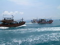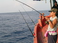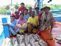 รุ่งอรุณเช้าวันใหม่ หลังจากได้สอบถามเรื่องเหยื่อของเรือแต่ละ ก็ทำให้พวกเราอุ่นใจหมดกังวลเรื่องเหยื่อ คราวนี้ ก็มาเป็นเรื่องปลา กันละ เสียงวิทยุสอบถามเรือแต่ละลำ ว่าใครได้ ลูกหมู กันแล้วบ้าง ซึ่งก็ได้รับคำตอบเป็นเสียงเดียวกัน ว่า ยังไม่ได้ นี่มันก็ปาเข้าไปจนเกือบจะบ่ายโมงแล้ว ยังไม่มี ทีมใดได้ปลากันเลย โดยเฉพาะทีม หมอผีใจง่าย บอกมาว่า ลูกทีมแต่ละคนเมากลิ้ง ยังไม่ตื่นนอนกันเลย บางคนนอนเอาขาไปพาดคอจุ่มโพ่ ที่กำลังทำอาหาร ดัง โผล่ะ เล่นเอาจุ่มโพ่นั่งทำอาหารไป นับดาวนับเดือนไปเลยละ ฮ่า! ส่วนทีม ปอบนมเปรี้ยว ได้แจ้งสถานการณ์มาว่า ปลาที่ตกได้ โดนหม่ำไปหมดแล้ว ปลาไม่พอหม่ำ ขณะนี้ สาวกปอบ กำลังอดอยากอย่างหนัก ถึงขั้นจะหม่ำไต๋ระ กันอยู่แล้ว ถึงกับขีดเส้นตายว่า ถ้าไต๋ระหาปลาให้หม่ำไม่ได้ บรรดาปอบ จะหม่ำไต๋ระแทน ทำเอาไต๋ระต้องรีบขับเรือตระเวนหาปลาให้กับบรรดาปอบ จนไม่รู้จักเหน็ดจักเหนื่อย มุ่งมั่นตระเวนหาปลามาเลี้ยงพวกปอบอย่างเอาเป็นเอาตาย คงจะกลัวว่าถ้าไม่ได้ปลามาจะโดนพวกปอบบนเรือแดรกเอาละ จิ ใช่ม่ะ ครับไต๋มะระ ส่วนเรือของทีม กุ๊กกิ๊ก นำทัพโดย ป๋าเหนี่ยว ก็ออกตระเวนวิ่งเรือจนน้ำบาน หาปลาจนเหงื่อแตก ซ๊ก ซ๊ก ซึ่งก็ไม่ผิดหวัง เมื่อป๋าเหนี่ยวของเรา นำพาลูกทีมทั้ง คุณโฟว์ และน้องเติ้ล ไปงัดเอาปลาเก๋า ไซร์ใหญ่ 9 กิโลกรัม และ 6 กิโลกรัมขึ้นมาประดับทีมถึง 2 ตัว ก็ต้องขอปรบมือให้กับผู้นำทัพ ป๋าเหนี่ยวของเรา กันละครับ