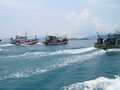 เพื่อนๆ ให้ความสนใจเรียนรู้ มารุมล้อมพี่หมู จนแน่น เหงื่อเม็ดโป้งๆ ผลุดขึ้นเต็มหน้าผาก พี่หมูเราก็ไม่ปริปากบ่นว่าร้อน เลยสักนิด (ก็นานๆ พี่หมูโอเชี่ยน จะได้เป็นพระเอก สักที เน๊อะพี่หมูว่า ม่ะ! ) เพื่อนๆ ตื่นเต้นกับความรู้ใหม่ที่ได้รับ ได้หัดทำเหยื่อ Jet ด้วยมือของตนเอง ทำเสร็จพี่หมูก็แสนจะใจดี ยกผลงานชิ้นนั้นให้คนทำ นำกลับไปเป็นที่ระลึกกันเลย งานนี้ไม่ปลื้มก็ไม่รู้จะว่ายังไงแล้วละจริง ม่ะครับ จนกระทั้งสมควรแก่เวลา ที่เราจะต้องแยกย้ายกันไปลงเรือใครเรือมันตามที่ได้จัดไว้ให้ โดยพี่หมูโอเชี่ยน และสมาชิก ทีมหมูหัน ไปลงเรือไต๋วุฒิ ที่ท่าเรือเซ็นเตอร์พอย ส่วน ทีมปอบนมเปรี้ยว นำโดยเฮียเล็ก เจ้าเดือน พี่ใหญ่และสาวกปอบ ไปลงเรือเนตรวารี ไต๋มะระ ส่วนทีมหมอผีใจง่าย นำทัพโดยหมอผีคิม และป๋าซิง กับสมาชิกปลาแมน ไปลงเรือไต๋เปีย ทีมนี้บอกว่า งานนี้แค่ได้ร่ำสุรากับเพื่อนผู้รู้ใจ ก็ Happy แล้วปลาเปอ ไม่ตก ไม่เป็นไร อีกทีมนำทัพโดย พี่เหนี่ยว ผู้พันกระดูกเหล็ก รับหน้าที่เป็นจอมทัพ นำลูกทีมในนาม ทีมกุ๊กกิ๊ก ลงเรือไต๋น้อง ส่วนทีมสุดท้าย ทีมนี้เป็นมือใหม่ทั้งทีม จึงตั้งชื่อทีมว่า ทีมมือใหม่ โดยมีผมนายชนบท เป็นผู้พาทีม ลงเรือไต๋ตี๋ใหญ่ และนับจากวันนี้ไปอีก 2 คืนกับอีก 2 วัน พวกเราจะมารวมตัว พร้อมกันอีกครั้งที่หน้าเกาะหวาย คืนนี้สิ่งที่สร้างความกังวลใจ ให้กับคนตกปลามากที่สุดก็เห็นจะเป็นเรื่องเหยื่อ เพราะคืนนี้ เป็นคืนข้างขึ้น 14 ค่ำ พระจันทร์จรัสแสงแดงแจ๋ การเฉอวนคงจะกระทำได้ยากลำบาก เมื่อเทียบกับคืนที่พระจันทร์ มืดตึดตื๊อ อย่างคืนข้างแรม ความหวังที่จะได้ปลาหมึกมาทำเหยื่อตกปลา ก็คงจะต้องให้เพื่อนๆ ในทีม ร่วมแรงร่วมใจช่วยกันตกปลาหมึก ด้วยเหยื่อโยทะกา ซึ่งมันก็เป็นวิธีเดียว ทีพอจะช่วยแก้ไข สถานการณ์ได้มาก สำหรับคืนที่พระจันทร์สว่างแจ้งแดงแจ๋ เช่นคืนนี้ และแล้วกิจกรรมแรกที่ต้องอาศัยความสามัคคีในกลุ่ม ก็เกิดขึ้น ทุกคนประจำหน้าที่ ใครมีหน้าที่ ตกปลาหมึก ก็ตกไป ใครมีหน้าที่ คอยปลดหมึกออกจากโยทะกา ก็ทำหน้าที่ของตัวเองไป ยามนี้เวลาประมาณ 3 ทุ่มเรือทุกลำ คงถอดสมอจอดตรงตำแหน่ง ที่ไต๋เรือแต่ละคาดการณ์ว่าจะมีหมึกเยอะมากที่สุด ค่ำคืนนี้ หน้าเกาะหวาย มีเรือลอยลำเปิดไฟไดน์หมึกอยู่เพียง 4 ลำ มองดูลักษณะแขนไฟของเรือแต่ละก็รู้ว่ามีเรือของใครบ้าง เอ๋ะ ! เรือของเจ้าเปีย แอบไปซุ้ม ไดน์หมึกแถวไหนละ เนี่ย ไต๋เปียคงจะไปซุ้มเปิดไฟไดน์หมึกที่อื่น เป็นแน่ ค่ำคืนนี้ก็คงจะมีเพียงแต่เรือของพวกเรา ทั้ง 5 ลำ ที่ออกมาลอ