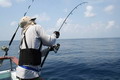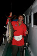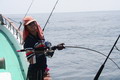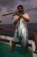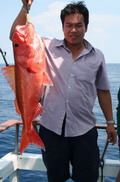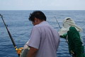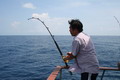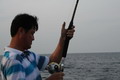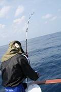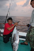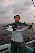 อ่ะ ท้ายเรือว่างแล้ว เราเอาโบนีต้าสีม่วงไปลากเล่นดีกว่าเผื่อฟลุ๊ก นายชนบทเอ่ยกับพี่ซิง ก่อนจะหยิบชุด Trolling ไปปล่อยสายโดยมีเหยื่อโบนีต้า สีม่วงคล่ำ เป็นทีเด็ด เวลาผ่านไปเกือบชั่วโมง ขณะที่กำลังนั่งคุยกันเพลินบนชั้นสองของเรือ เสียงรอก Shimano 30 WLRS ก็แผลดเสียงคำรามกึกก้อง เรียกให้ผู้สนทนาต้องหยุดแล้วหันมามองยังแหล่งที่มาของเสียง ซึ่งภาพที่ได้เห็น คือคัน Pen inter โค้งงอตามแรงกระชากเสียงรอกยังร้องไม่หยุด นายชนบท ไม่รอช้าเท้าก้าวลงมาจากชั้นสองของเรือตั้งแต่เมื่อไหร่ ไม่อาจจำได้ มารู้ตัวอีกที ก็คว้าคันขึ้นมา Set Hook แล้ว เพียงได้สัมพัสจับคัน ก็รับรู้ถึงพลังมหาศาลของตัวที่อยู่ปลายสายได้ทันที แรงกระชากรุนแรงอย่างนี้ ปลาตัวนี้ต้องไม่ธรรมดาแน่ ม่ะ นายต้น อยากเจอของใหญ่ใช่มั๊ย มาเลยตัวนี้ใหญ่แน่ๆ นายชนบทเอ่ยปาก เมื่อเห็นนายต้น มายื่นโชว์หุ่นอยู่ข้างๆ มาเลยขอให้เป็นปลาเถอะ ต้นชอบอยู่แล้ว นายต้นยื่นมือมารับคันไปอัด มันปลาหรือเปล่า วะ ไม่เห็นมันวิ่งเลย นายต้น พึมพำ ขณะที่มือหมุนแขนกว้านปั่นเก็บสายเข้ามา อย่างง่ายดายโดยไม่มีแรงขัดขืนจากตัวปลายสายแต่อย่างใด ปลา ชัวร์ เลยต้น ตัวใหญ่ด้วยนายชนบทร้องย่ำอย่างมันใจ ทันใดนั้นเอง เพียงนายชนบทกล่าวจบประโยค เจ้าตัวปลายสาย มันคงได้ยินจึงใส่เกียร์หมาออกแรงวิ่งอย่างรวดเร็ว