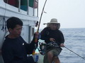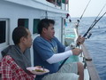 เริ่มต้นเช้าวันใหม่ ตะวันยังไม่โผล่ส่องแสง สมาชิกเริ่มตื่นจากการหลับใหล นายเล็กศรีราชา ผู้ขยันตื่นขึ้นมาก็ไม่พูดพล่ามทำเพลง เดินไปคว้าคันตีป๊อบ ออกไปยืนหวดหัวเรือ และเพียงไม้แรกเท่านั้นก็ได้เรื่อง กะมงตาเหลือก ที่วิ่งไล่เหยื่อป๊อบ ทะยานตัวพุ่งงาบเหยื่อป๊อบของนายเล็กศรีราชาเข้าเต็มปาก โห... ตื่นมาก็ได้ออกกำลังแต่เช้าเลยนะเล็ก โยชนบทเอ่ยปากแซว ขณะที่มือกุมคันเบ็ดโยกขึ้นโยกลง ตามกรรมวิธี Jigging ทันใดนั้นเอง คันเบ็ดในมือก็มีแรงจากปลายสายกระชากอย่างแรง อุ๊บ หู้ยยยย หนักอึ้ง เลย ท่าจะตัวใหญ่ นายชนบทสบถออกมา ก่อนจะวัดคันย้ำเบ็ดไป 2 ทีก่อนจะหันไปชักชวนนายเล็กให้มาตกแบบวิธีเดียวกัน เล็ก ไม่ลอง Jig ดูละ เช้ามืดอย่างนี้ น่ามีตัวใหญ่อยู่นะ นายชนบทร้องบอก นายเล็กศรีราชา จึงหันมาเล่น เหยื่อ Jig และมันก็ไม่ทำให้นายเล็กศรีราชาผิดหวัง เมื่อปลาเข้าชาร์ทเหยื่อ Jig ที่นายเล็กส่งลงไปวาดลวดลาย โดนแล้ว อึ๊บ นี่แน่ะ หนักอึ้งชะมัด นายเล็กกัดฟันดังกรอกๆ สองแขนเกร็งเต็มเหนี่ยว งัดคันที่โค้งงองุ้มแทบจะหัก สาย PE 4 กรีดน้ำวิ่งปรู๊ด ออกห่างจากเรือ สปูลวิ่งเร็วจี๊ นายเล็กพยายามรังคันตั้งไว้ รอโอกาสที่เมื่อไหร่ มันหยุดวิ่งจะเป็นทีของเขาบ้าง มันวิ่งไปท้ายเรือแล้ว เล็กตามไปอัดท้ายเรือดีกว้าเดี๋ยวสายจะพันกัน โยชนบทร้องบอกเพราะเกรงว่าผลาจะวิ่งพาสายไปพันกัน แล้วมันจะยุ่ง ยามนี้ดวงตะวันค่อยโผล่ขึ้นจากผิวน้ำ เพื่อนๆ ตื่นนอนกันหมดแล้ว บ้างก็มายืนเชียร์ และให้กำลังใจ นายเล็กอัดปลา บ้างก็คว้าคันเบ็ดไปตกปลา