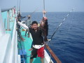 เอาหวานๆ สิครับคุณโย ขมๆ ต้องยกให้เจ้าหนุ่ยมันนู้น มันชอบ ประเภทน้องมายทะเลาะไม่เลิก ฮะ ฮ่า พี่ชาญกล่าว แต่ยังไม่วายหันไปแซว นายหนุ่ยบึงสำราญ ทันทีที่นายชนบท โรยสายส่งเหยื่อถึงพื้น ปลายคันเบ็ดที่ถืออยู่ในมือก็โน้มลง นายชนบทรับรู้ด้วยสัญชาตญาณ ว่าโดนทักทายเข้าให้แล้ว เขาค่อยๆ ลดคันลงเพื่อส่งเหยื่อให้มันขย้ำ ก่อนจะออกแรงวัดคัน ตึ๊บ...นี่แน่ะ อยู่แล้วพี่ชาญ มารับไปอัดเลยพี่ นายชนบทกล่าวพร้อมยื่นคันส่งให้พี่ชาญ รับไปทำหน้าที่มือสังหาร พี่ชาญรับรู้ถึงแรงอันมหาศาล ของคู่ต่อกรทันที ที่รับคันจากนายชนบทมาถือ ปลาตัวนี้ตัวใหญ่น่าดู แรงมันดึงแรงน่าดู ไม่ใช่น้องมายแน่นะ คุณโย พี่ชาญกล่าว ขณะที่มือทั้งสองข้างกุมด้ามคันเบ็ดไว้มั่น ไม่ใช่น้องมายแน่นอนพี่ เพราะมันกินเหยื่อไม่เหมือนฉลาม พี่รีบอัดเร็วๆ ก่อนที่มันจะเข้ารูเดี๋ยวจะอดนะพี่ นายชนบทฟันธง ดังเปรี้ยงพร้อมกับบอกให้พี่ชาญรีบเร่งงัดคู่ต่อกรโดยเร็ว พี่ชาญพอได้ยินดังนั้น จึงกัดฟันดังกรอด กร๊อด รวบรวมแรงที่มี ออกแรงงัดคัน อึบบบบบ อ๊ากกกกก เสียงพี่ชาญ แหกปากร้องลั่น ทำเอาเพื่อนๆ ที่ได้ยินต่างหันขวับมองมายังพี่ชาญเป็นจุดเดียว โอ้โห้ พี่เล่นของใหญ่เลยนะพี่ อุ๊บ ของผมโดนแล้ว เย้ ดีใจจัง บังเลาะ ขณะที่กำลังเอ่ยปากแซวพี่ชาญ อยู่นั้นก็โดนปลาเจ้ากรรมฉวยเหยื่ออย่างรุนแรง มันดึงคันเบ็ดแทบหลุดจากมือ ยามนี้ไม่ว่าจะหันไปมองทางไหน ก็เห็นภาพเพื่อนๆ หลายคนกำลังโน้มคันอัดปลาเฉกเช่นเดียวกับพี่ชาญ ตลอดแนวลำเรือ ไม่ว่าจะเป็นพี่ไพรวัลย์ พี่ซิง เจ้ายอด เล็กศรีราชา หรือแม้แต่นายหนุ่ยบึงสำราญ อ้าว เบียร์ ไม่ลงคันเบ็ดเหรอ นายชนบทเห็นนายเบียร์ ยืนลุ่นพี่ชาญ อยู่จึงถามออกไป ผมไม่ได้เอาชุดใหญ่มา เออ ไม่ใช่ดิ ผมไม่มีชุดใหญ่ต่างหาก เลยได้แต่ยืนดู แค่ได้ดูก็มันส์แล้วพี่ แฮะ แฮะ นายเบียร์กล่าวอย่างอารมณ์ดี นายชนบทจึงกล่าวต่อไปว่า เดี๋ยวคอยต่อพี่ชาญแล้วกัน นะ ตัวต่อไปของเบียร์นะ รออัดได้เลย เดี๋ยวพี่จัดให้ นายชนบทกล่าว