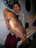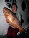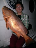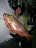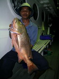 ในขณะกำลังชื่นชมแดงเขี้ยวของพี่อยู่นั้น ข้างกาบเรือก็งัดเอาปลาแดงเขี้ยว ซึ่งมีขนาดใหญ่กว่าตัวแรก ขึ้นมากลบเสียงฮือฮา เมื่อครู่ลงอย่างสิ้นเชิง โอ้ โห้ ไอ้เขี้ยวตัวนี้ บั๊กละกั๊ก กว่าตัวแรก สะอีก สงสัยเราจะมาอยู่กลางดงไอ้เขี้ยวสะแล้ว ม้างไต๋หนู ในขณะที่กำลังชื่นชมแดงเขี้ยวยักษ์ ที่หาตัวขนาดนี้ไม่ค่อยจะได้ง่ายๆ ทางหัวเรือ ก็กำลังวุ่นวายกับปลาอังเกยที่เข้ามาโฉบเหยื่อหมึกตายเป็นระยะพลอยให้ไม่เหงา แต่แล้วปลาที่ฉวยเหยื่ออยู่ดีๆ ก็หยุดกินเหยื่อไปเสียดื้อๆ เอ๊ะ นั้นตัวอะไรขาวๆ ว่ายน้ำเร็วมากเลยเห็นมั๊ยครับ เฮียสมรวยกล่าวพร้อมกับชี้นิ้วให้เราดู วัตถุก้อนสีขาว ที่ว่ายอยู่ทางท้ายเรือบริเวณปลายแสงไฟ นั้นมันปลาโลมาเผือกนี่หว่า แย่แล้วดันมีปลาโลมามากวนสงสัยต้องย้ายเรือหนีแล้วละ ปลาโลมาตัวใหญ่เกิน 200 กิโล เข้ามาว่ายน้ำไล่กินปลา บริเวณที่เราจอดเรือตกปลา คงจะไม่มีปลาตัวไหนกล้าแหยมออกมาแน่ เราจึงจำเป็นต้องย้ายหมายไปยังที่ใหม่เพื่อหลบเจ้าโลมาเผือก เราตกปลาจนเหยื่อตายที่ซื้อมา 20 กิโล หมดเกลี้ยงไม่เหลือหรอ จะมีก็เพียงปลาหมึกหอม 4-5 ตัวที่เราตกได้เมื่อคืน