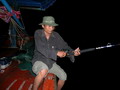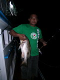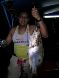 งานนี้ ฝ่ายทีม หมูหัน เรือไต๋วุฒิ ได้แจ้งสถานการณ์มาว่า ไปแงะเอาอังเกยยักษ์ ไซร์เกือบ 10 กิโลกรัม ขึ้นมาหลายตัวแล้ว เล่นเอาคนที่ได้ยิน อิจฉาตาร้อนไปตามๆ กันส่วนทีม ละอ่อน น้องใหม่ที่พึ่งจะตกปลาทะเลเกือบจะทั้งทีม ทำท่าว่าจะไปได้สวย เมื่อคุณตั้ม ที่พึ่งจะจับคันเบ็ดตกปลาทะเลเป็นครั้งแรกเป็นผู้เปิดประเดิม ทริบด้วยปลาเก๋า ไซร์ เกือบจะ 4 กิโลกรัมขึ้นมา จากนั้นก็โดนลองของอีก 1 ดอก เมื่อโดนปลาเก๋าลูกหมู งับเบ็ดเล่นเอามือใหม่ที่พึ่งจะ เปิดจุก สดๆ ซิ่งๆ ทำอะไรไม่ถูกได้แต่ถือคันรั้งอย่างเดียว จนในที่สุด มันก็พาเข้ารูไปตามระเบียบ แม้ ตี๋ใหญ่จะพยายามใช้วิชาแงะรู ที่ขึ้นชื่อลือชา เป็นที่ยอมรับในหมู่คนตกปลาไปทั่วทั้งย่านน้ำ ก็ไม่สามารถที่จะ แงะเจ้าลูกหมู ตัวนี้ให้พ้นจากรู ได้ในที่สุดสายเอ็น 40 ปอนด์ ก็ขาดกระจาย เมื่อเรานำสายเอ็นที่ขาดมาตรวจสอบ ก็พบว่าเอ็นเป็นรอยถลอกปอกเปิกเป็นแนวยาวเกือบ 3 เมตรเมื่อรวมกับสายหน้าที่ที่ขาดติดปากปลาไปอีก 2 เมตร แสดงว่า ปลามันมุดเข้าไปอยู่ในรู ลึกเกือบจะ 5 เมตร โอ้โห! มิน่าละมือใหม่อย่าง คุณตั้ม ถึงกับโดนปลาอัดจนหัวสั่นหัวคอนอย่างนั้น ทริบนี้ไม่รู้เป็นยังไง ปลาก็ไม่ค่อยจะฉวยเหยื่อ พอจะมีปลาฉวยหน่อย ไม่หลุดก็ขาด มีอยู่ 2 อย่าง